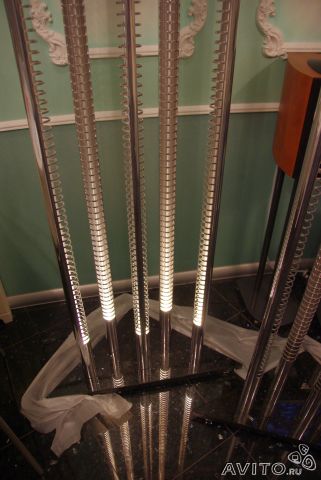 Подсветка: встроенные лампы 5 х 12 Вт и 2 x 20 Вт. Сенсорное включение и выключение, 2 степени яркости. Чтобы включить подсветку нужно дотронуться до любой части стойки, при втором прикосновении яркость усиливается, при третьем - подсветка гаснет.