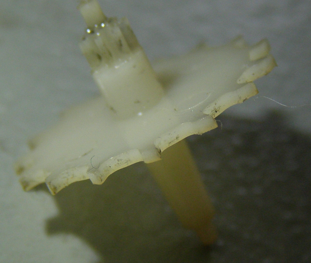 В общем, вчера я провозился с часами, и благодаря вашим советам, особое внимание уделил анкерному колесу. У меня есть пара старых реле времени от стиральных машинок, и в одной из них оказалось почти такое же пластиковое колесо, увы, почти! При первом взгляде они были одинаковыми, но после перестановки оказалось, что зубья там хоть и тем же количеством- шесть, но другого профиля, и сам венец с зубьями толще, и само колесо относительно оси чуть ниже, но это не критично оказалось, в итоге колесо туго проворачивалось с рывками, так что на замену не годится. А еще там оказалась "зеркальная" вилка, я ее тоже хотел заменить, а нет, разве что если штифты перепресовать!