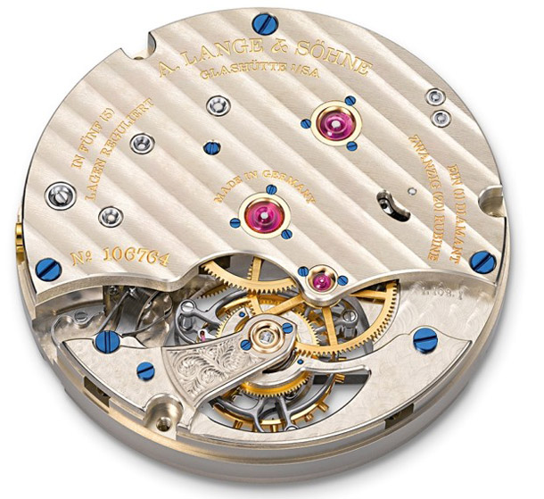 Механизм новых часов 1815 Tourbillon также оснащён этим запатентованным устройством, часть деталей которого можно разглядеть в окне циферблата. Однако на этот раз конструкторы механизмов Lange пошли ещё дальше, добавив к устройству остановки секундной стрелки также запатентованное устройство Zero-Reset. Оно заставляет маленькую секундную стрелку, изготовленную из воронёной стали, мгновенно перепрыгнуть в нулевое положение, как только заводная головка вытаскивается для коррекции времени.