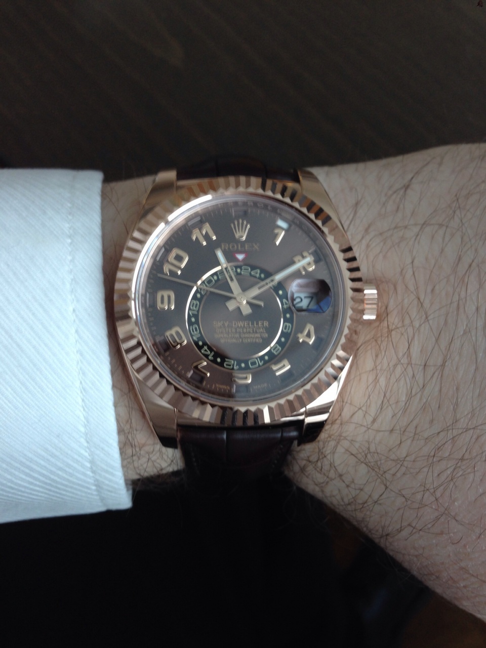 Получил сегодня Ская, восторг полный Выбирал между этим вариантом и Президентом в белом золоте, Скай победил в основном благодаря механизму (годовик, второй пояс, command bezel). На руку сели отлично, излишне крупно не смотрятся. Буду делиться впечатлениями в этой теме и дальше. И фото еще будут