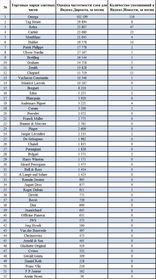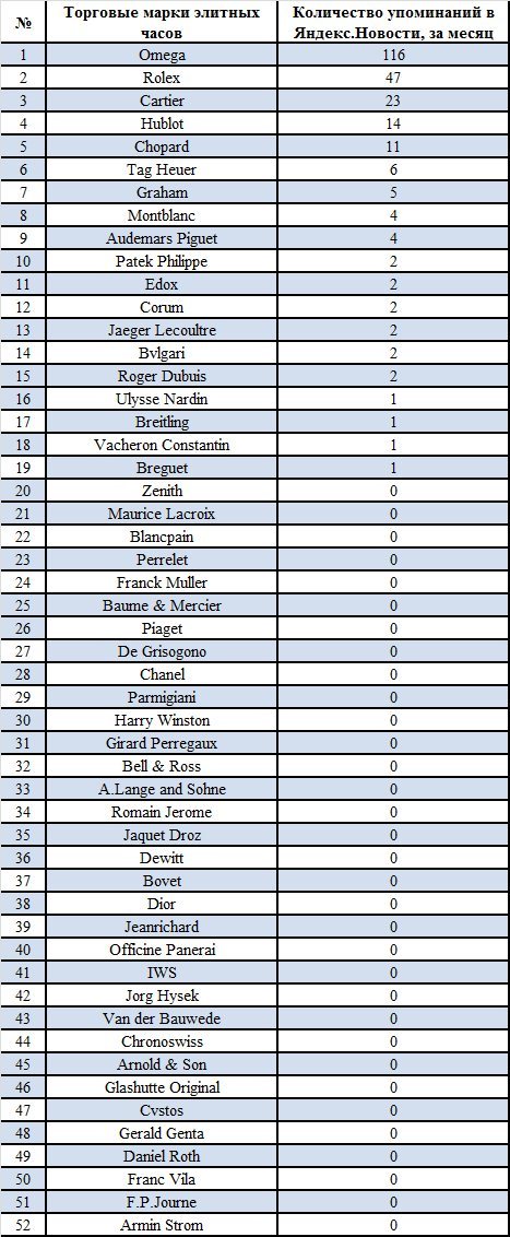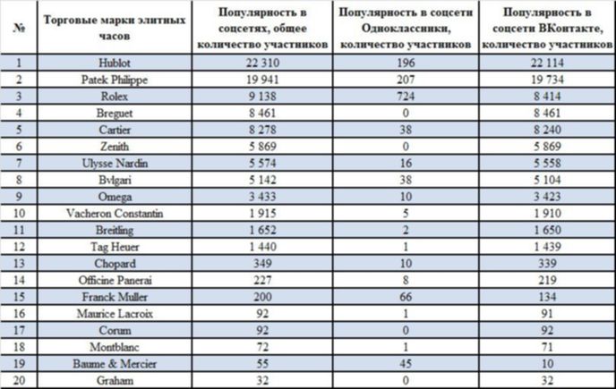 Данные таблицы, предоставленной аналитиками журнала "Биржевой лидер", говорят о том, что пиар-политика известных марок часов слабо направлена в сторону Интернета, одними из самых популярных здесь стали:
