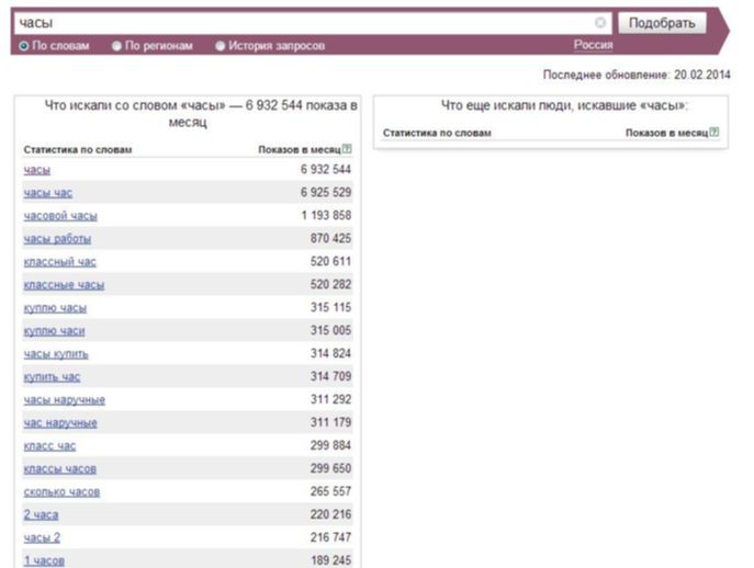Запрос "часы" был введен россиянами в поисковой системе Яндекс 6 932 544 раза за последний месяц.