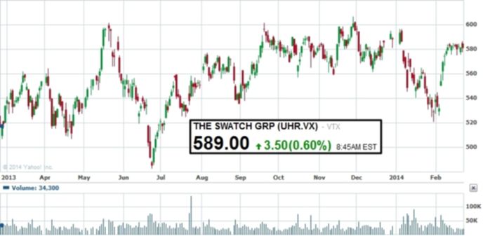 Сегодня, 25-го февраля 2014 г., акции компании Swatch THE SWATCH GRP (UHR.VX) торгуются на бирже в стратегическом флете на отметке 589,00 долларов США: