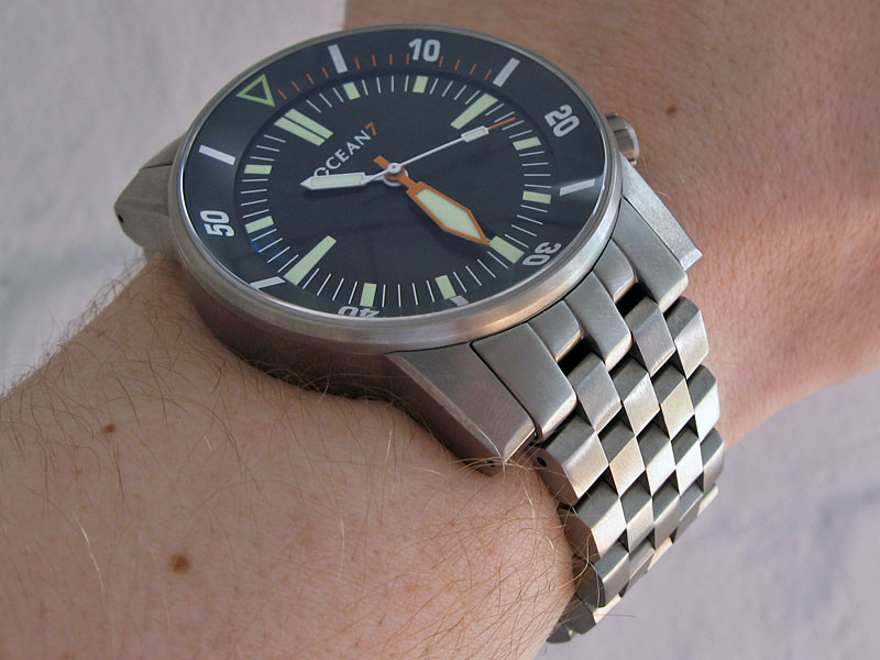 Титановый механический дайвер от американского бренда Ocean7, редко встречающийся в продаже. Крупные, но легкие часы с лаконичным дизайном.