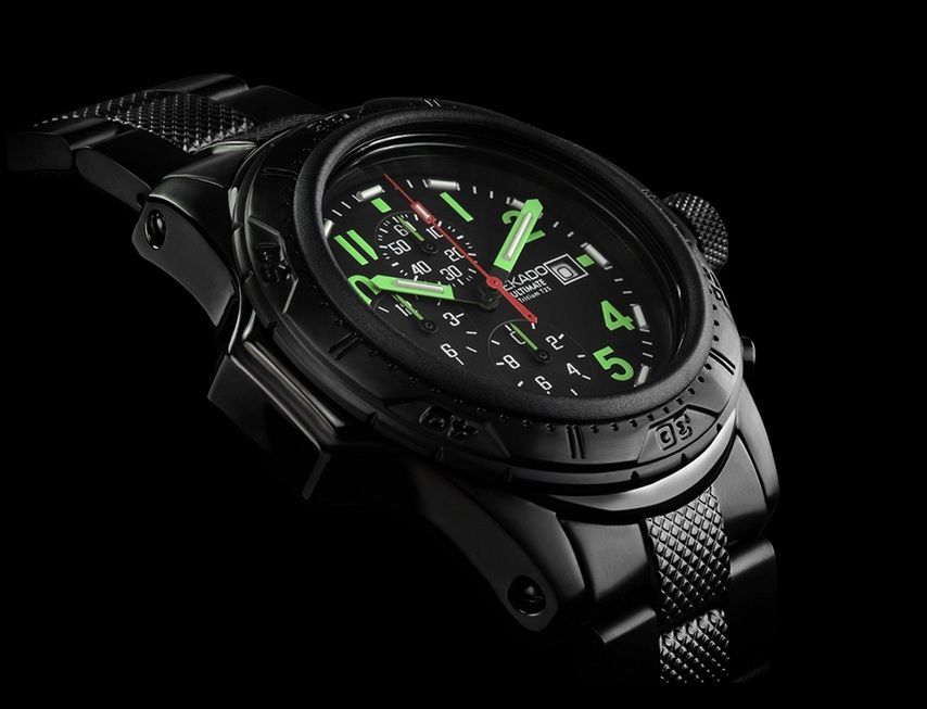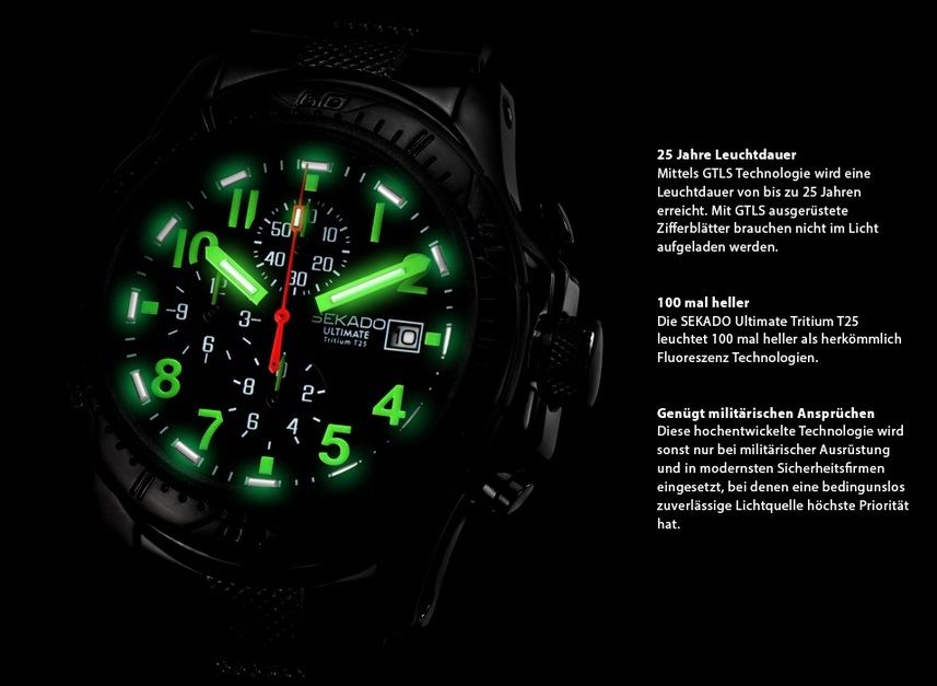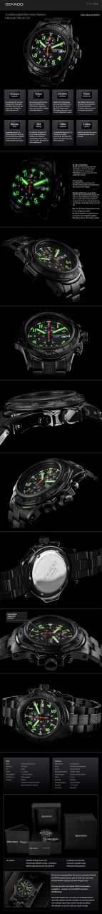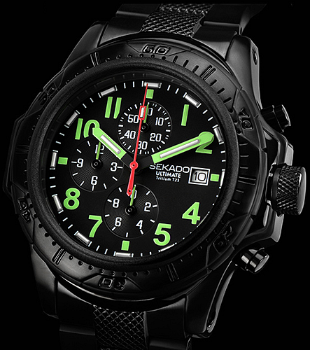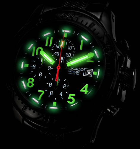 - Циферблат - черный, включает в себя также 3 дополнительных циферблата (часы хронографа(направление на 9ч.), минуты хронографа(направление на 12ч.), секунды основного времени/ двадцатые доли секунды в режиме хронографа(направление на 6ч.)). На циферблате присутствуют арабские цифры 1, 2, 4, 5, 7, 8, 10, 11 нанесенные флуоресцентной (светящейся) краской. Эта-же краска нанесена на стрелки (под колбами с тритием). На часовой и минутной стрелках часов, а ткже секундной хронографа расположены тритиевые колбы, обеспечивающие постоянную подсветку. Так-же тритиевые колбы расположены по внешнему радиусу циферблата с шагом в 1ч. По направлению на 3ч расположен индикатор даты. Слева от которого надпись "SEKADO ULTIMATE Tritium T25"
