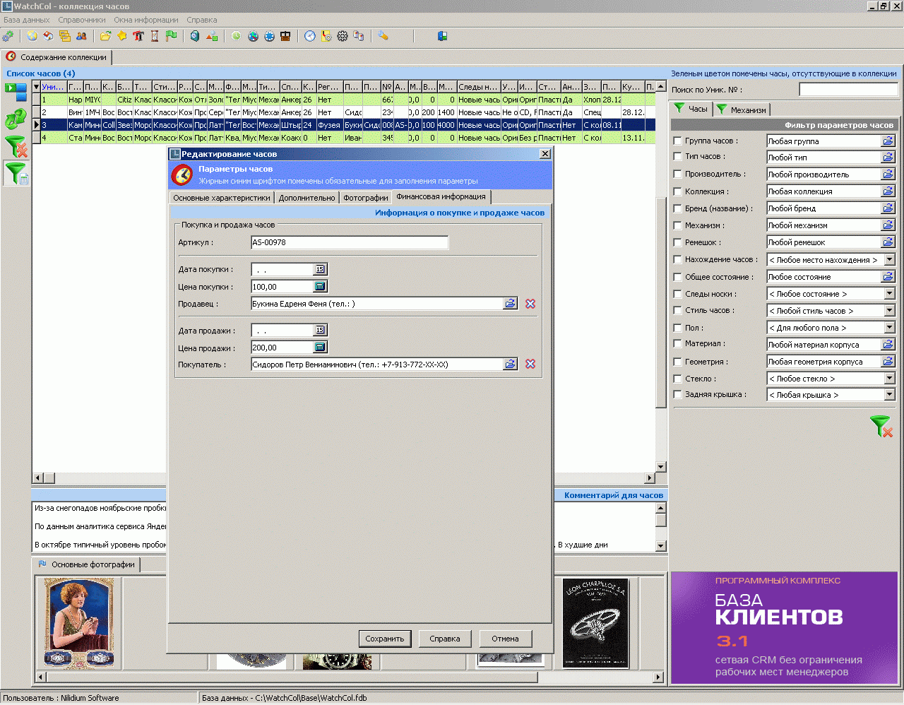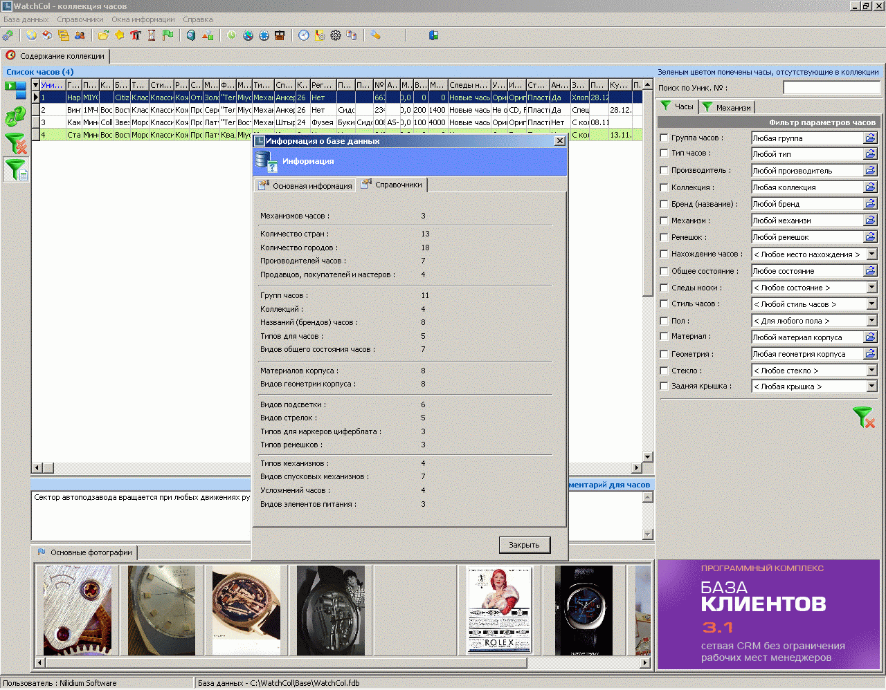 В целом, программа на меня произвела позитивное впечатление, но для моих задач она чересчур наворочена по структуре данных. Такой функционал, как мне кажется, будет востребован в часовых мастерских, магазинах и среди коллекционеров, которые собирают часы и имеют солидное количество экземпляров. Для простых часовых