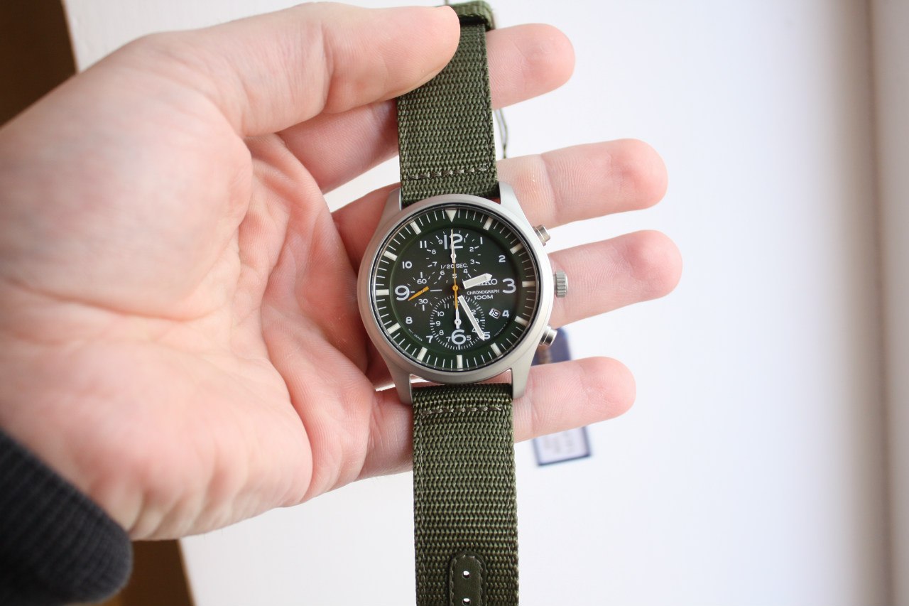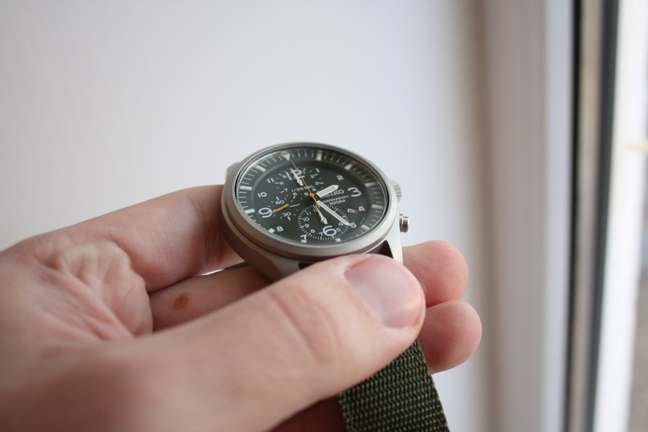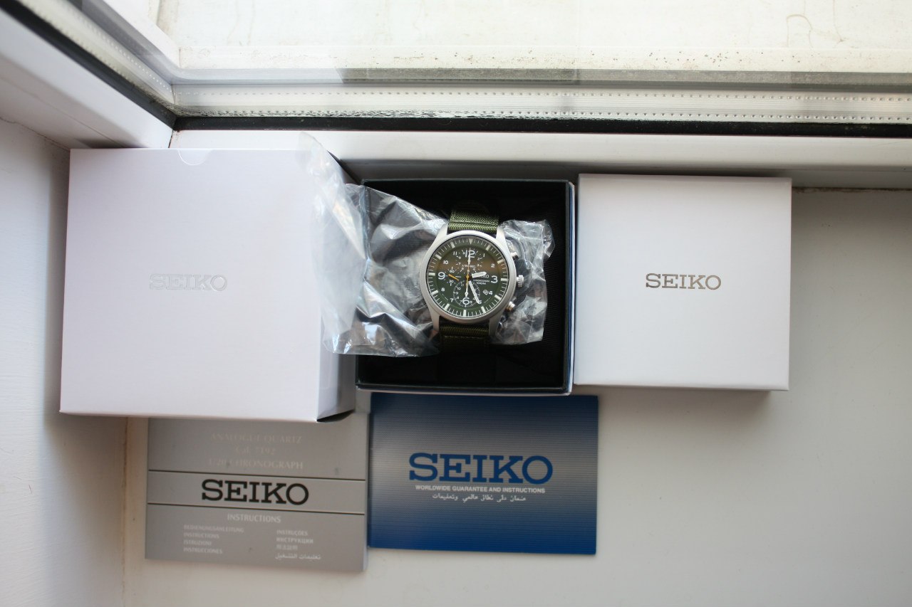 Мужские кварцевые часы. Корпус этих часов крупного размера (44 мм.) и выполнен из нержавеющей стали. Модель SNDA27P1 имеет стекло хардлекс, текстильный ремешок зеленого(защитного) цвета, Зеленый циферблат. Водоустойчивость: 100 метров. Дополнительные функции и особенности: дата, хронограф. Полная заводская комплектация Seiko