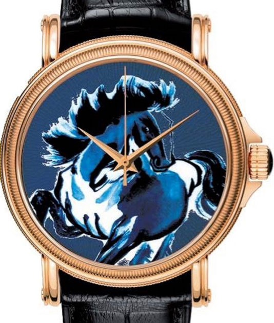 Круглый полированный корпус новинки изготовлен из 18-каратного розового золота, диаметром 42,0 мм, водонепроницаемый до 50 метров. Фиксированный безель и боковая стенка корпуса рифленые. Завинчивающаяся защищенная заводная головка расположена на 3 часах. Задняя крышка часового корпуса завинчивающаяся. Сапфировое стекло защищает циферблат с художественным изображением гарцующего коня, выполненного в крайне трудоемкой и сложной технике выемчатой эмали (Champlevé Grand Feu enamel). Разметка на циферблате отсутствует. Стрелки золотые.