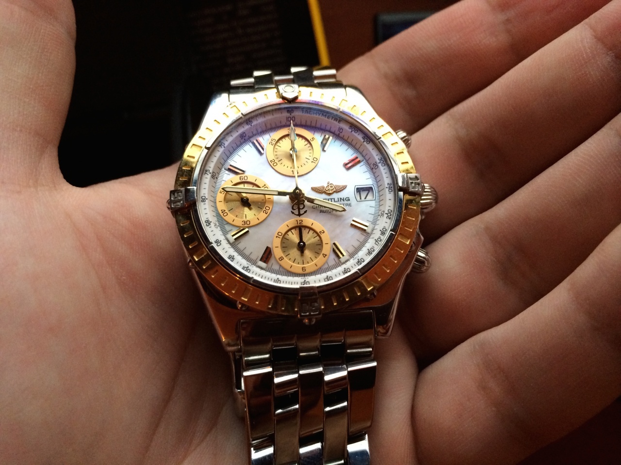 Breitling Chronomat D13352 . Корпус сталь и золото 750 пр. Циферблат - перламутр . Редкое и необычное исполнение, в живую смотрится очень красиво.