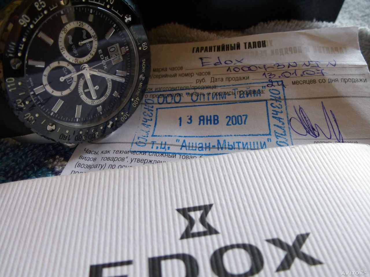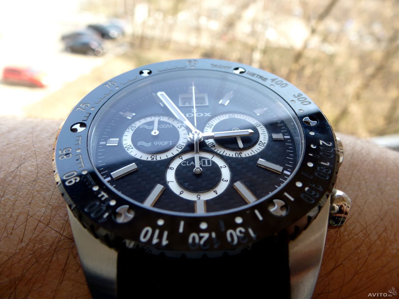 Продается кварцевый хронограф Edox Class 1. Корпус - нержавеющая сталь, циферблат - карбон, стрелки со светонакопителем, водонепроницаемость - 300м. Ремень - каучук, укороченный, под запястье не более 18см(!).. Состояние - на 4, мелкие царапины на задней крышке, и по бокам.. Сапфировое стекло и керамический безель - в идеале, некоторые цифры на безеле стерлись(на фото видно). Техническое состояние отличное, все работает, ход точный, батарейку менял год назад..