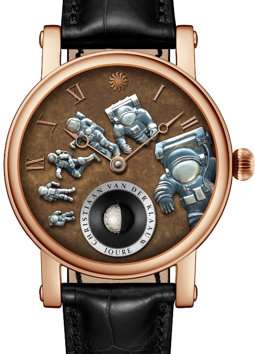 В текущем году голландская часовая компания Christiaan van der Klaauw, известная своими астрономическими часами, представила свою новую модель Rush Hour at the Moon, отличающуюся гравированными объемными изображениями космонавтов на циферблате, а также отделкой калибра, выполненными известным мастером-гравером Kees Engelbarts, а также эксклюзивным указателем фаз Луны, не требующий регулировки 11000 лет.