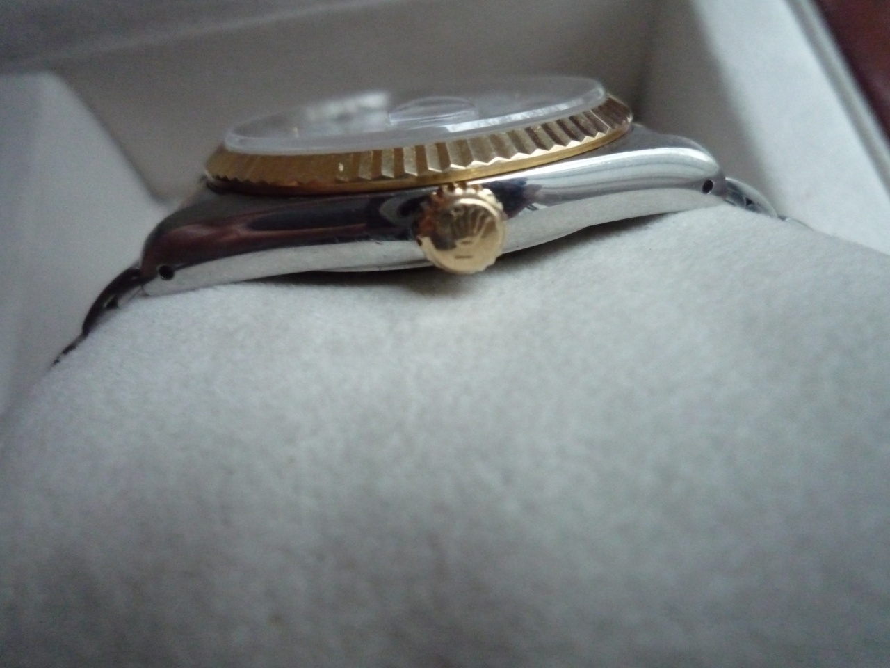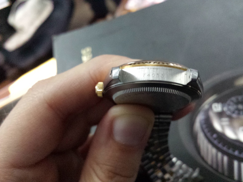 Корпус Oyster Rolex из нержавеющей стали, безель fluted из желтого золота 750 пробы, заводной ключ из желтого золота с логотипом Rolex.