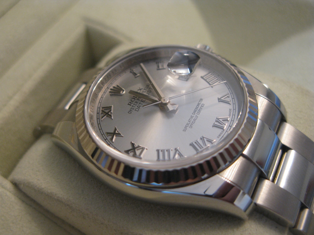 Но мне повезло, и в продаже по весьма недурной цене найден Rolex Datejust (36 мм),сталь,рифленый безель, браслет Oyster, серебристый циферблат, римские цифры. Диалог с самим собой быстро расставил приоритеты: