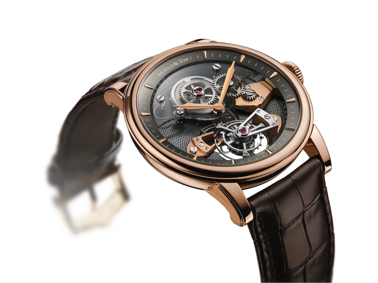 Новая лимитированная модель TES Tourbillon (Ref. 1SJAR.V01A.C112A) от британской часовой компании Arnold & Son (выпускающей свои часы в Швейцарии) отличается сапфировым мостом над заводным барабаном, что обеспечивает прекрасный обзор работы деталей калибра.