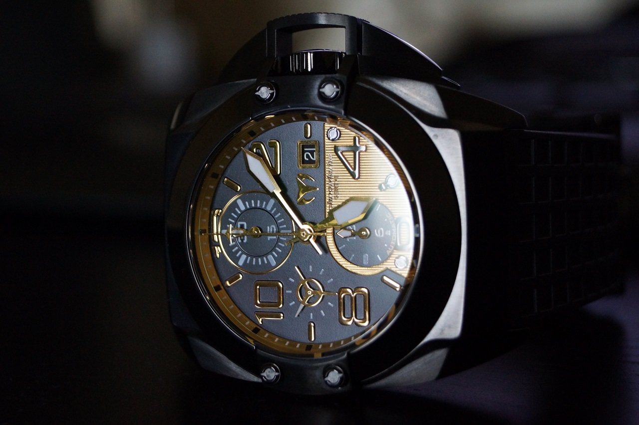 Хронограф из нержавеющей стали с черным PVD-покрытием.