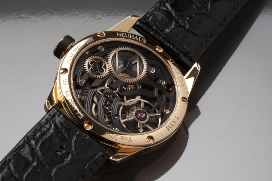 Круглый полированный корпус новинки изготовлен из 18-каратного розового золота, диаметром 44,0 мм, водонепроницаемый до 50 метров. На торце заводной головки, расположенной на 3 часах, нанесен логотип бренда NEUHAUS Inventing Timepieces. Сапфировое стекло установлено на лицевой стороне корпуса (с антибликовым покрытием) и на его завинчивающейся задней крышке. Модель отличается двойной скоростью (DoubleSpeed) движения стрелки, то есть она совершает оборот 360° в течение шести часов. В связи с этим, на черном циферблате имеется двойная разметка часов римскими цифрами (дважды по шесть часов). Причем, каждый час размечен на полчаса, четверть и пять минут. Из-за увеличенной скорости вращения стрелки, промежутки между делениями на шкале в два раза больше, чем на обычном циферблате, что существенно облегчает считываемость показателей. На белых индексах и стрелке - люминесцентное покрытие. Индикация работы часов осуществляется в трех апертурах, расположенных на 6 часах, в которых вращаются черный и белый диски, меняя цвет каждые две секунды.