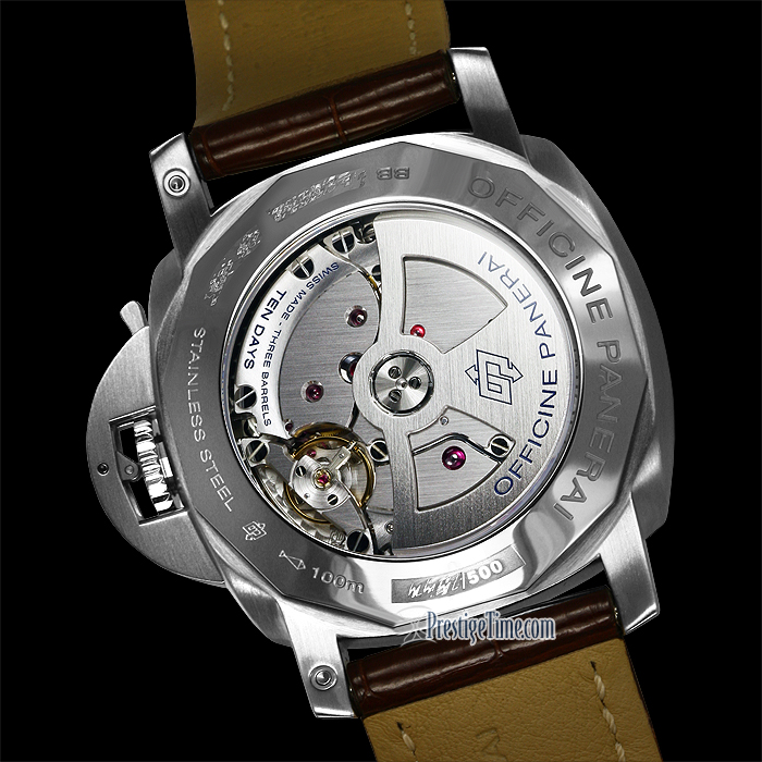 Механизм: Автоматический механизм, калибр Panerai P.2003, производство Panerai, 13¾ линии, толщина 8 мм, 25 камней, баланс из сплава Glucydur®, 28 800 полуколебаний/час. Противоударное устройство KIF Parechoc®. Запас хода 10 дней, три заводных барабана, система установки секундной стрелки на ноль. 296 деталей.