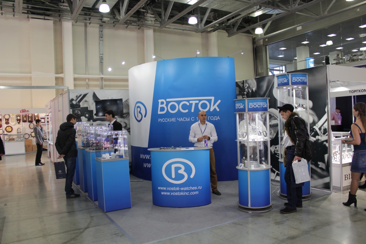 У Востока был большой павильон, оформленный в фирменных цветах компании. Слева были расположены стенды с выкладкой часов: женские модели, новые командирские, командирские К-34 и механизмы. Так же слева был расположен большой экран, который демонстрировал ролики о работе завода. Ролики показывали, как происходит сборка часов, проверка механизмов, описывались технологические процессы. В центре павильона находилась стойка с выставленными новыми моделями командирских часов, там же были