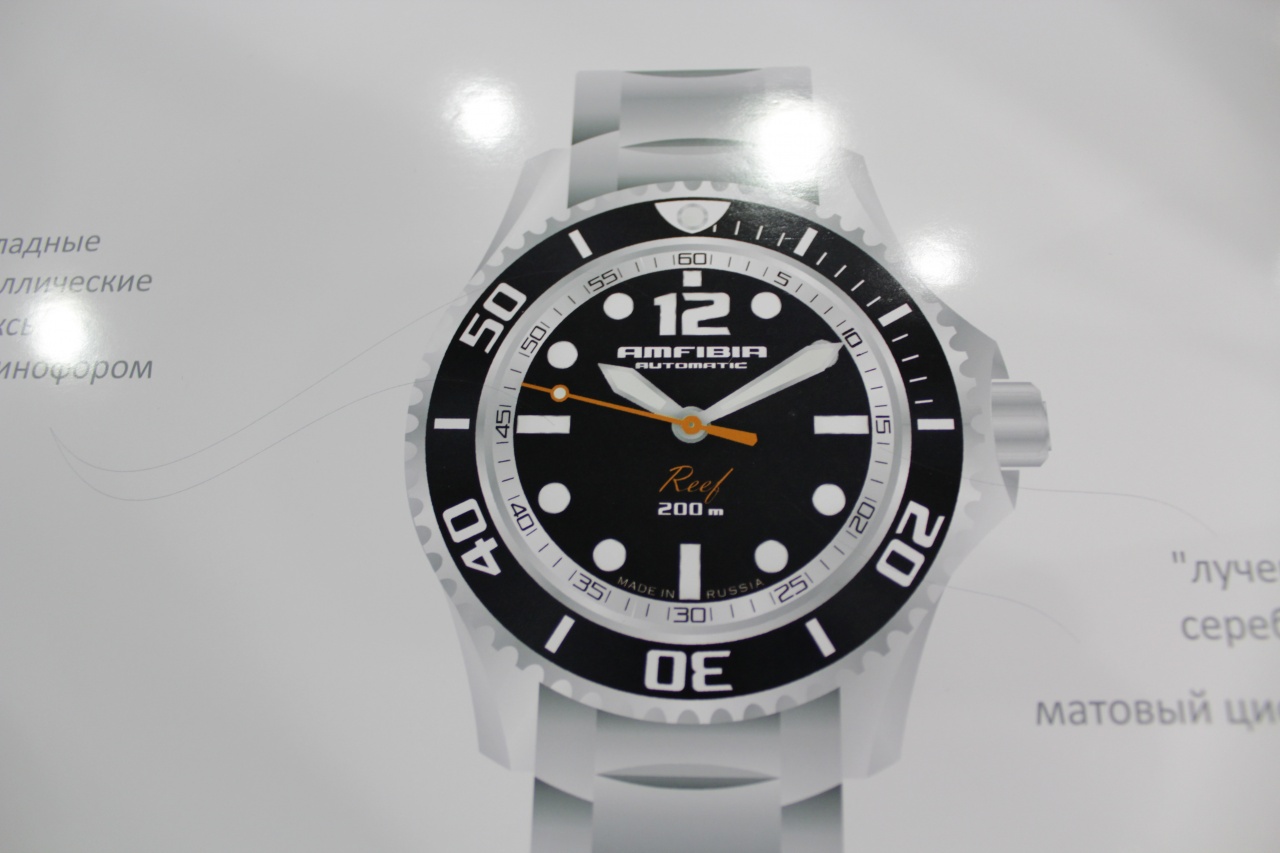 дизайны новых амфибий и сотрудники завода рассказывали о новинках и отвечали на все вопросы. Всем посетителям выдавали фирменный пакет с набором информационных материалов о выпускаемых заводом моделях часов и механизмов.Справа на вращающихся витринах расположились коллекции турбин и текущих амфибий. Посетителей, не смотря на последний день выставки было много, пустым павильон не удалось сфотографировать. Среди посетителей было замечено много молодежи, которая интересуется продукцией завода. Я приехал на выставку с желтым рифом, когда стоял и общался с сотрудниками завода к нам подошел молодой парень с таким же рифом на руке ))