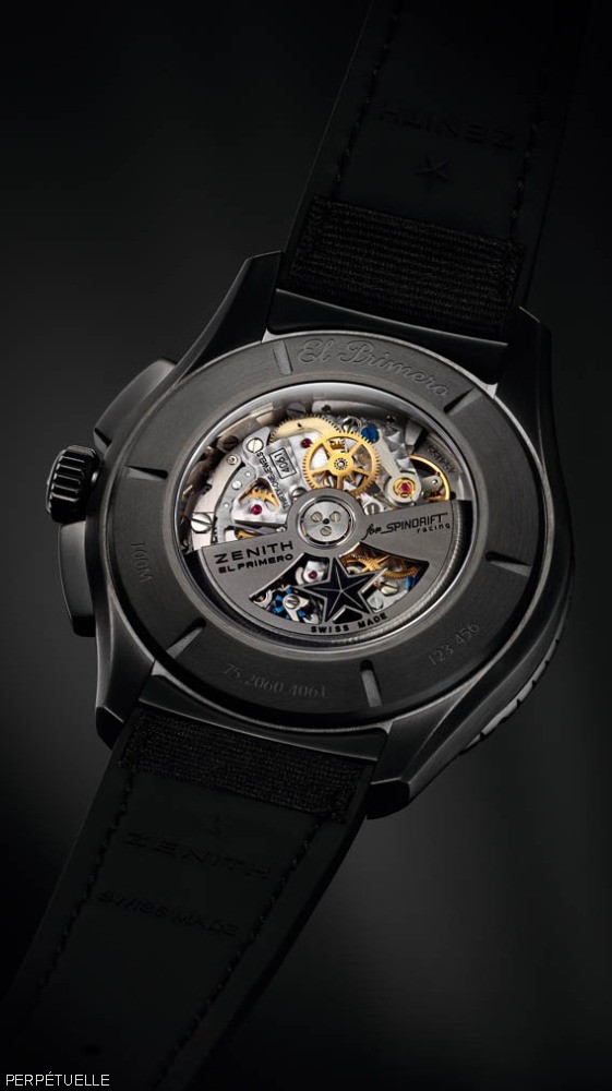 Модель оснащена мануфактурным швейцарским автоматическим механизмом Zenith El Primero 4061, с колонным колесом, кремниевым спусковым колесом, на 31 камне, с балансовой частотой 36000 полуколебаний в час (4 гц), запасом хода 50 часов, функциями индикации часов, минут (посредством соответствующих центральных стрелок), секунд (посредством стрехстрелочного указателя, расположенном на 9 часах), а также с хронографом (центральная секундная стрелка, круглый аналоговый 30-минутный счетчик, расположенный на 3 часах и круглый аналоговый 12-часовый счетчик, расположенный на 6 часах). Ротор автоподзавода декорирован "женевскими волнами" ("Côtes De Geneve"), на него нанесены надписи: "Zenith El Primero" на одной стороне и "for Spindrift Racing" на другой.