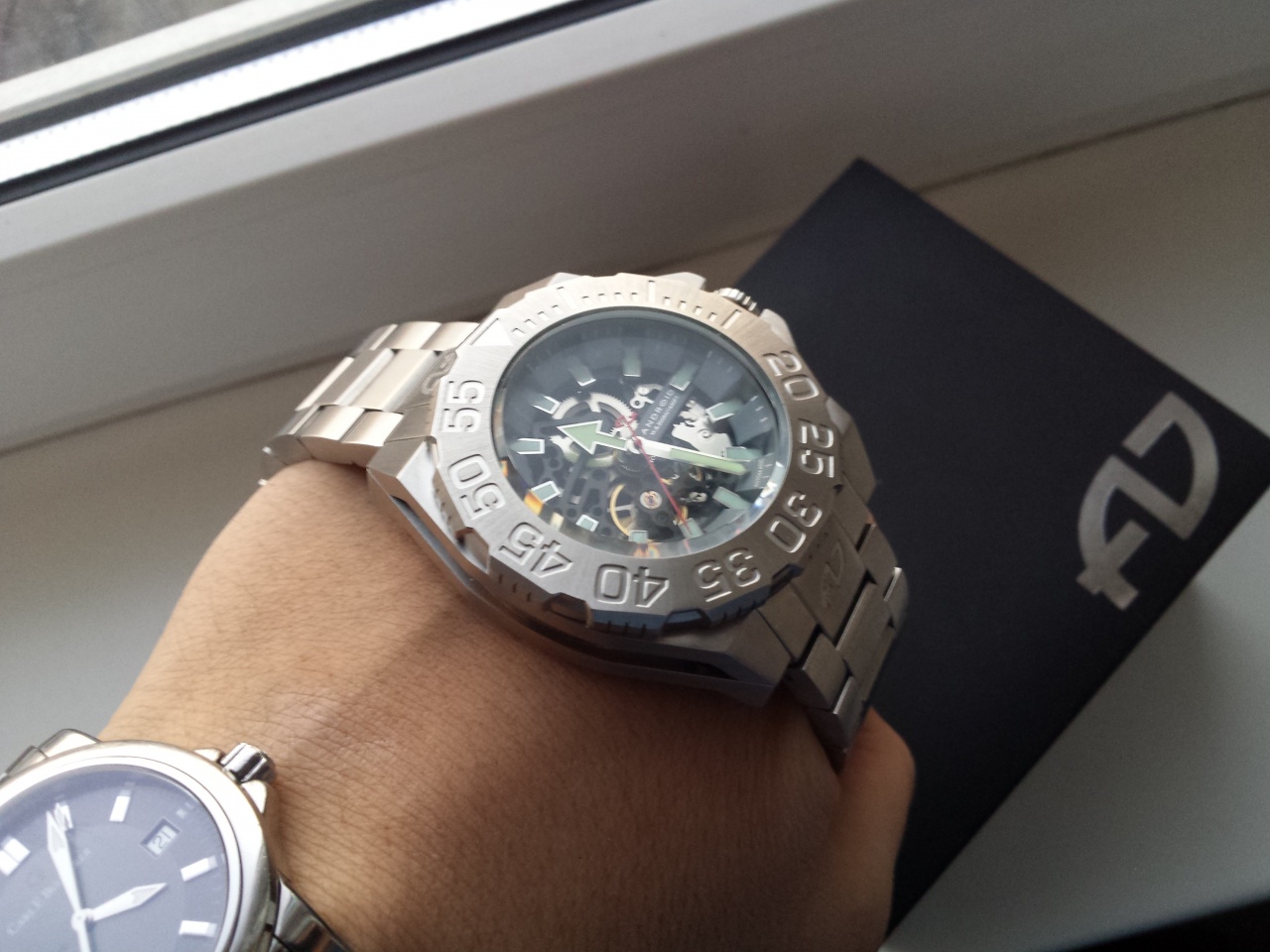 Огромный красивый 500 метровый дайвер с надежным механическим сердцем. Очень красивая отделка механизма. Необычное и интересное сочетание формфактора "скелетон" и классического дайверского стиля.