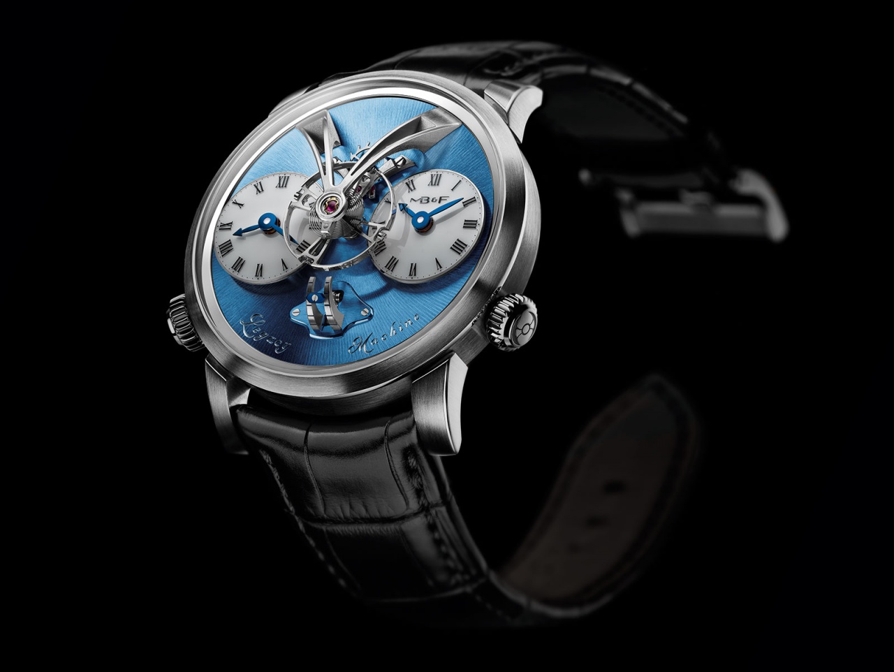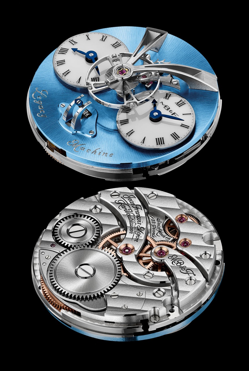 Модель оснащена трехмерным швейцарским механизмом с ручным заводом от Chronode (выпущенным специально для MB&F), а его создателями являются Жан-Франсуа Можон (Jean-François Mojon) и Кари Вотилайнен (Kari Voutilainen) - об этом свидетельствует и гравировка с их именами на мосту калибра. Механизм состоит из 279 деталей, на 23 камнях, с брегетированной балансовой пружиной, балансовой частотой 18000 полуколебаний в час (2,5 гц), одним заводным барабаном, запасом хода 45 часов. Обращает на себя внимание балансовое колесо, диаметром 14 мм, с четырьмя регулировочными винтами, "парящее" над механизмом и циферблатом. Калибр отменно отделан и декорирован, с использованием, в частности, ручной гравировки, полированных скосов, "женевских волн", золотых шатонов. Функции: индикация часов и минут в двух часовых поясах (на двух боковых циферблатах, расположенных на 9 и 3 часах), а также запаса хода (посредством соответствующего уникального вертикального указателя, расположенного на 6 часах)