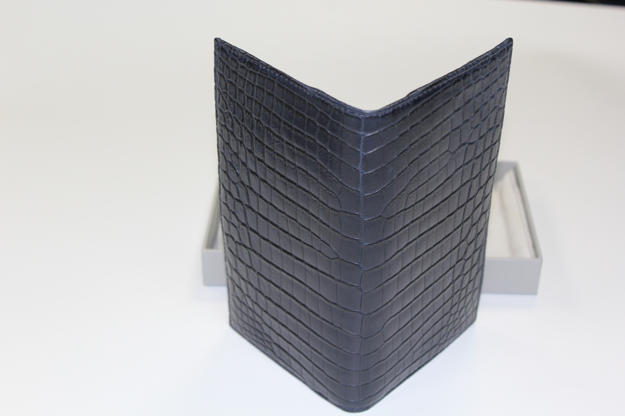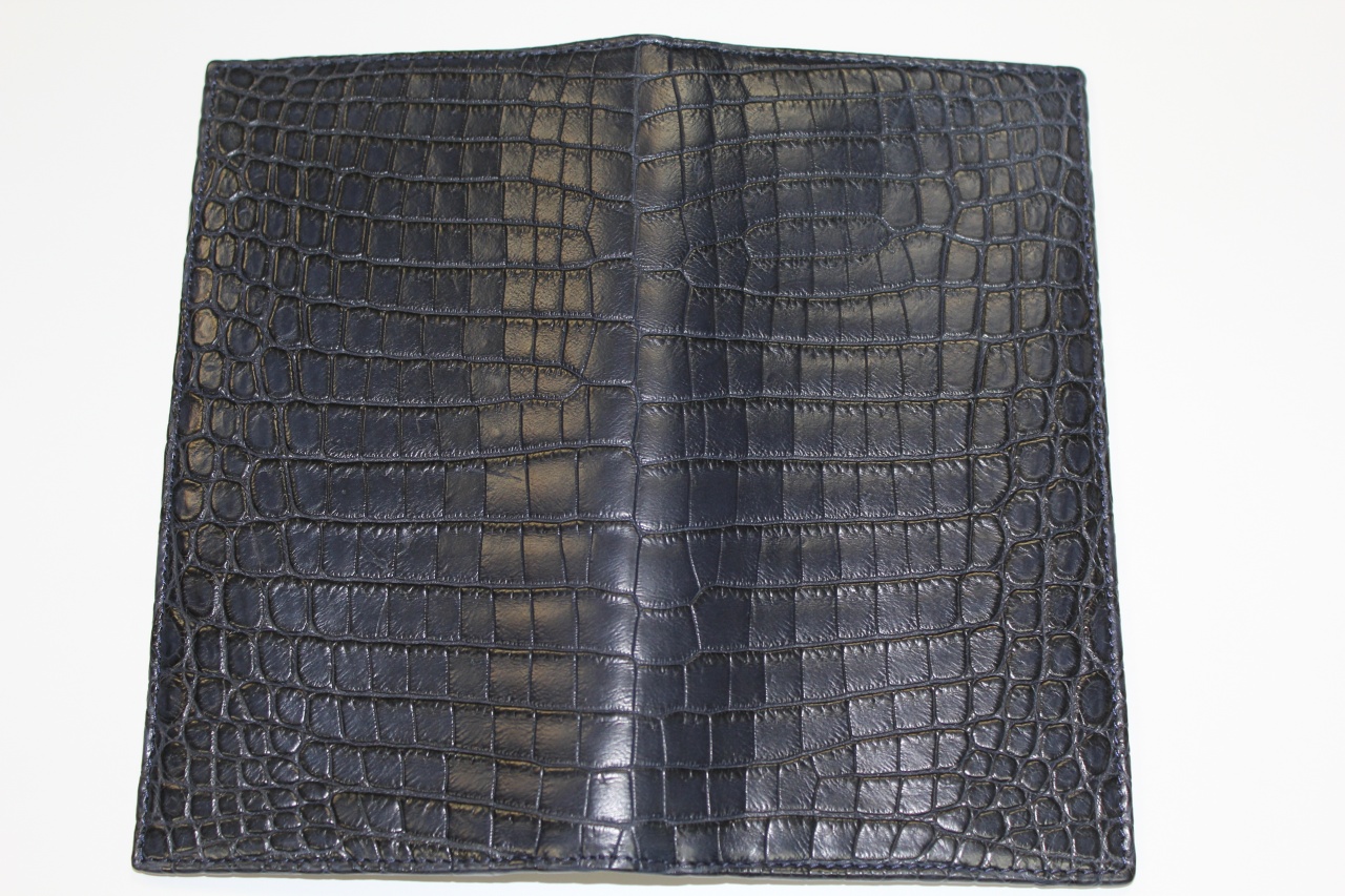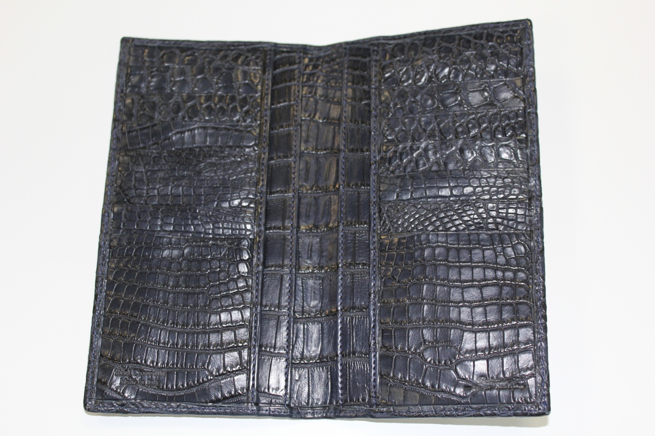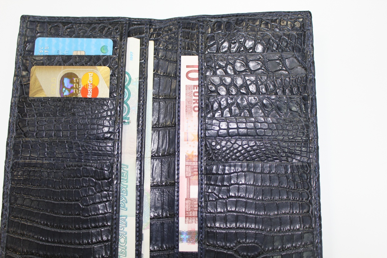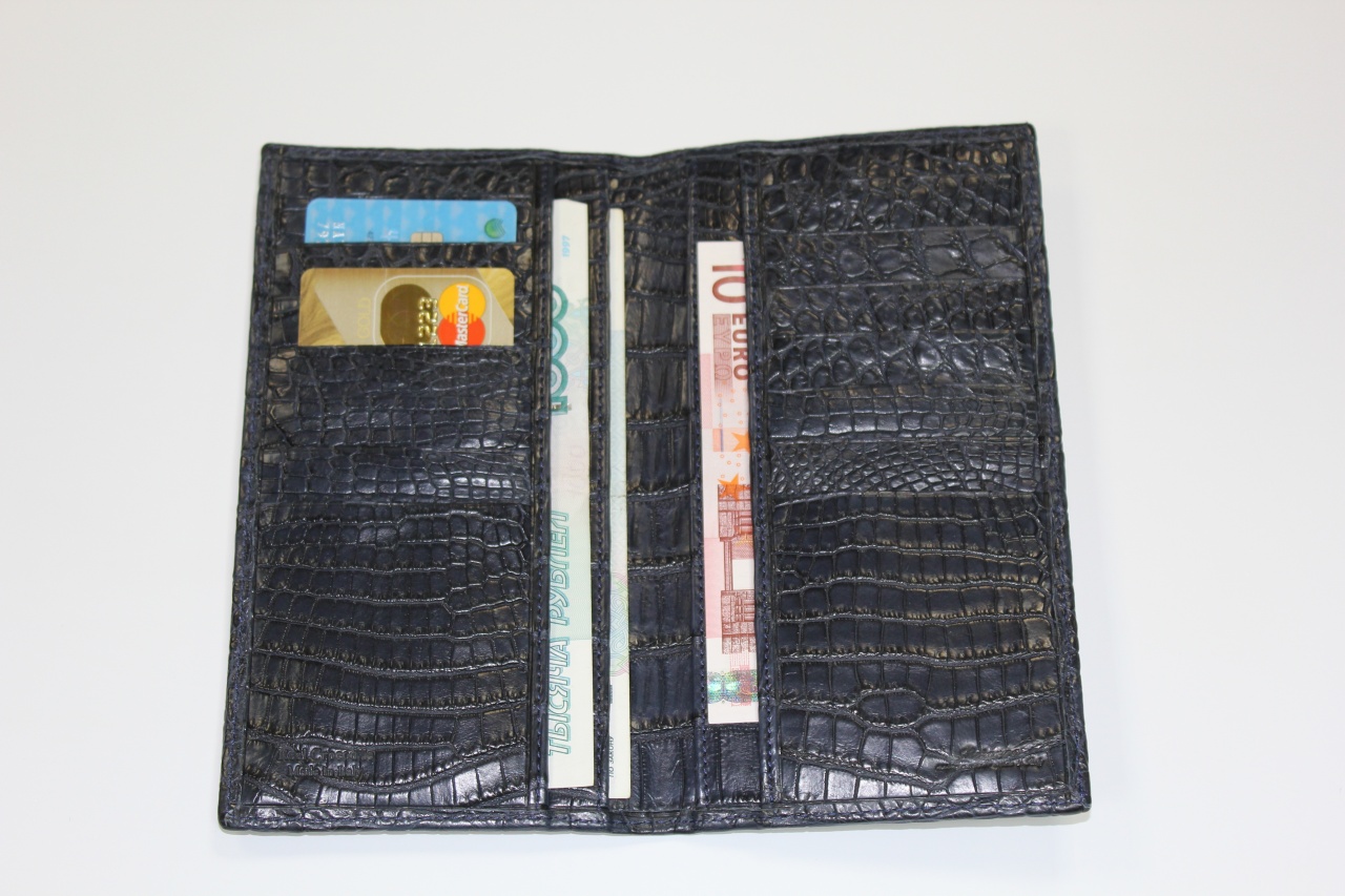 Элегантное портмоне ручной работы «Brianza» из 100% кожи нильского крокодила высочайшего качества выделки с матовой поверхностью. Цвет темно-синий. Изготовлено из цельного куска кожи с живота крокодила. Портмоне имеет четыре больших отделения для банкнот и четырнадцать отделений для кредитных карт или визиток. Внутренняя отделка портмоне также из кожи нильского крокодила.