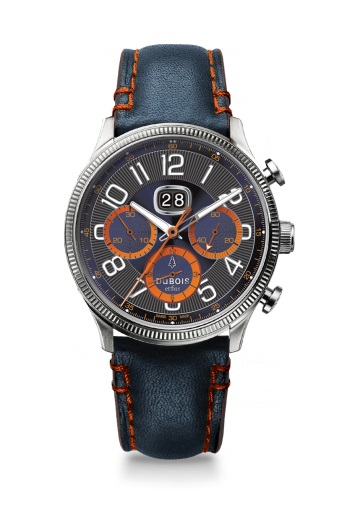 Новая модель DBF001-10 от швейцарской часовой компании DuBois et fils имеет круглый, частично полированный и частично сатинированный, корпус, изготовленный из нержавеющей стали 316L, диаметром 41,5 мм, водонепроницаемый до 50 метров. Фиксированный рифленый безель. Рифленая же заводная головка расположена на 3 часах; пушеры хронографа - на 2 и 4 часах. Сапфировое стекло защищает гильошированный циферблат черного и синего цвета, с родированными накладными арабскими цифрами, часовыми индексами, часовой, минутной и секундной стрелками, покрытыми люминесцентным составом белого цвета. Обращают на себя внимание оранжевые элементы отделки циферблата, в частности шкалы малых боковых циферблатов и стрелки на них.