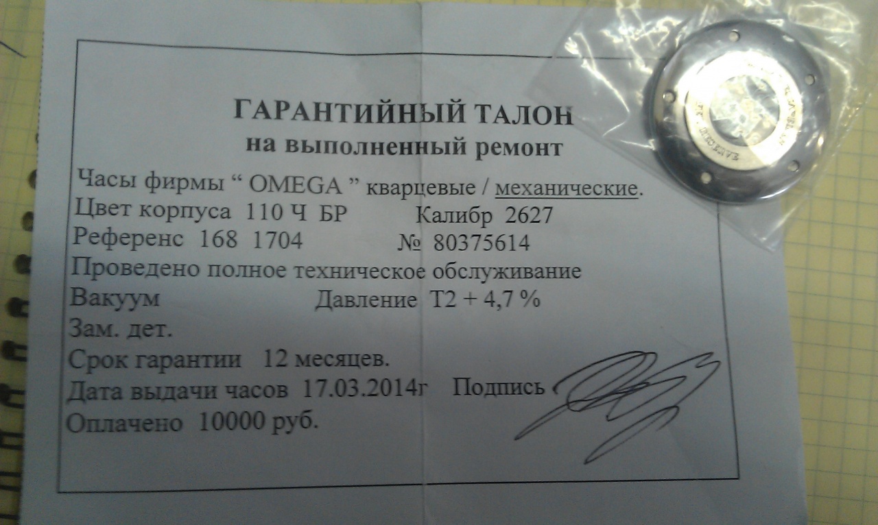 В 2014 году сделано полное обслуживание в Новосибирском Консуле (фото), так как новые часы не носились, и стали отставать - заменена смазка, в общем, сделано все. Сейчас точность хода как у кварца. Еще на гарантии.