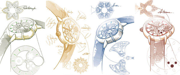 Среди представленных на выставке часов Vincent Berard – новые модели Luvorene ограниченной серии в корпусе большего диаметра – 45 мм, а также яркая коллекция Luvorene Four Seasons, название которой говорит само за себя. Набор состоит из четырех моделей наручных часов, символизирующих весну, лето, осень и зиму. Корпус, циферблат ручной работы и застежка часов изготовлены из 18К золота. Для «Весны» мастер взял золото зеленого оттенка и рассыпал по циферблату изумруды в виде часовых меток.