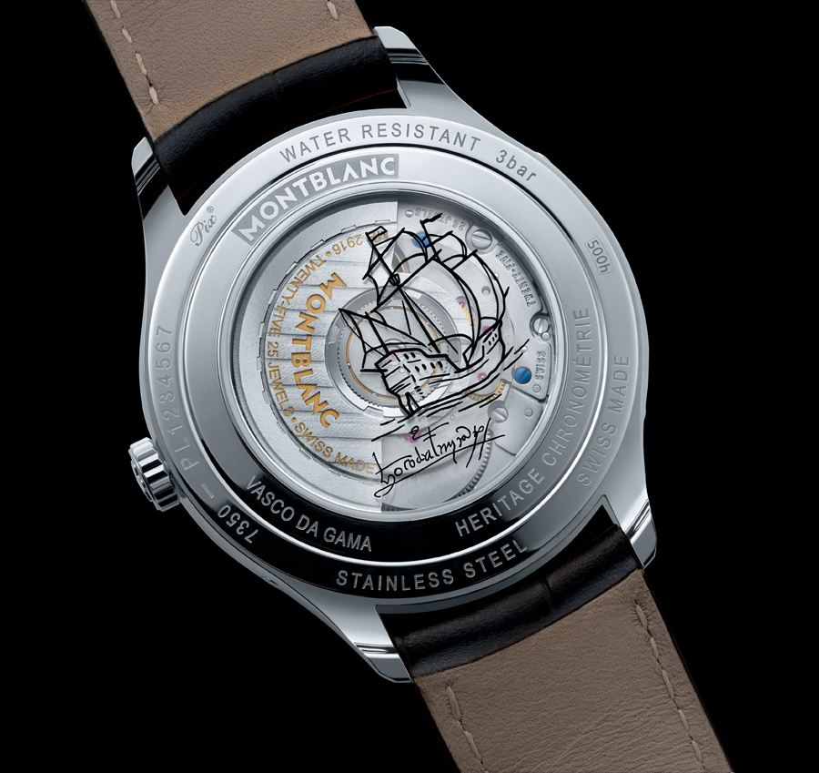 На международной часовой выставке SIHH-2015 (SALON INTERNATIONAL DE LA HAUTE HORLOGERIE), прошедшей в Женеве, швейцарский часовой производитель Montblanc представил свою новую лимитированную модель Heritage Chronométrie Quantième Complet Vasco da Gama, которая, как это и следует из ее названия, посвящена Васко да Гаме - знаменитому португальскому мореплавателю эпохи Великих географических открытий, прославившемуся открытием морского пути из Европы в Индию.