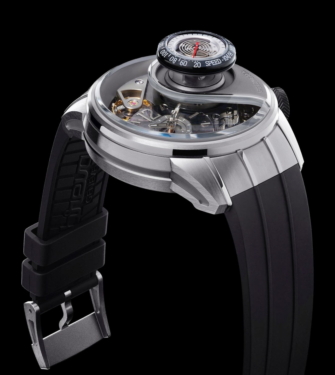 Сатинированный корпус новинки, состоящий из 83 деталей, изготовлен из титана G5, диаметром 44,70 мм, толщиной 15,70 мм (общая толщина корпуса и закрытого спидометра, расположенного на 2 часах, составляет 17,50 мм, а при открытом спидометре - 23,50 мм), водонепроницаемый до 30 метров (при закрытом спидометре, а при открытом - пыленепроницаемый). Заводная головка расположена на 4 часах, пушер, открывающий спидометр - на 2 часах. Сапфировое стекло с двусторонним антибликовым покрытием установлено на передней стороне часового корпуса и на его завинчивающейся задней крышке. Циферблат сложный, многоуровневый, частично скелетонизированный.