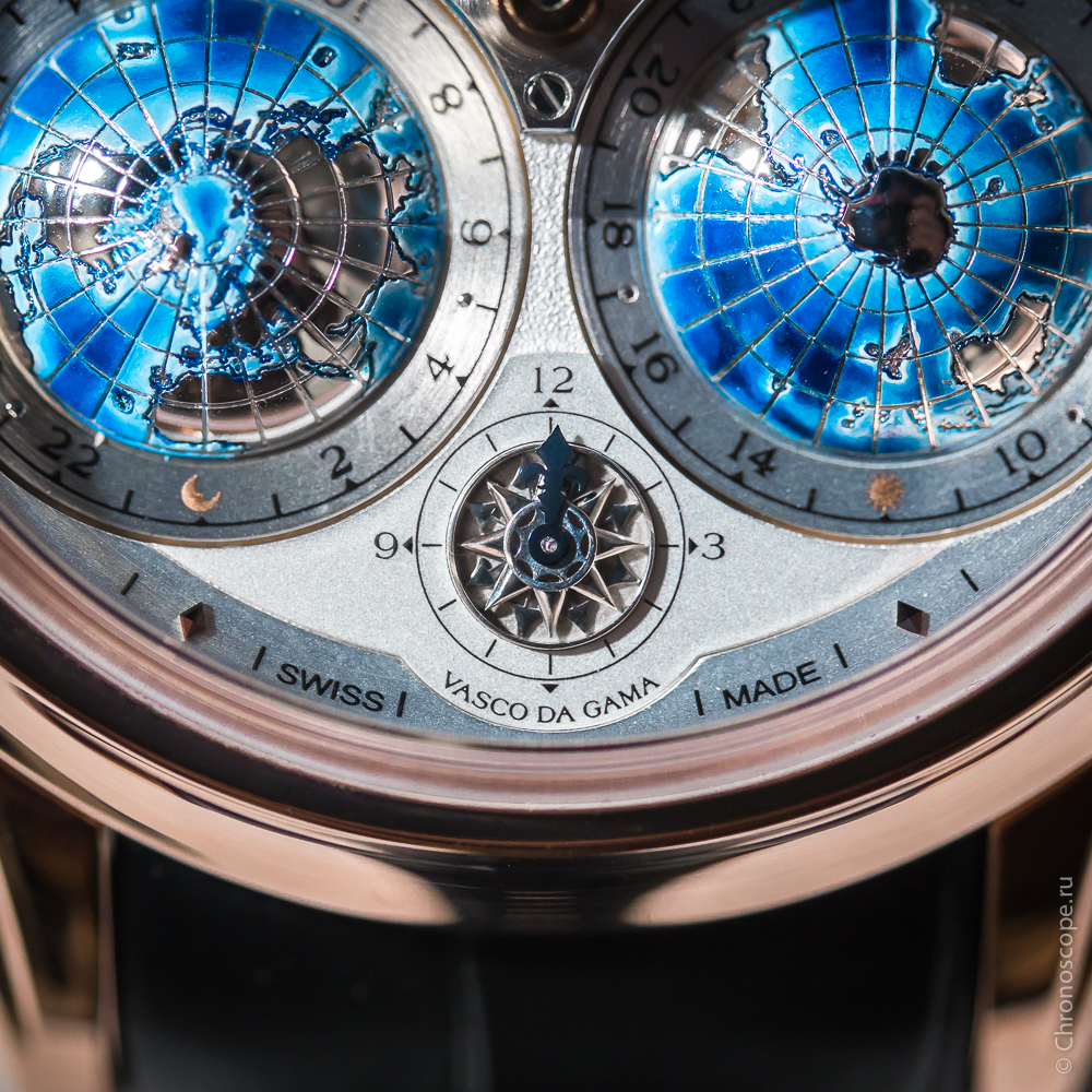 Над циферблатом часов возвышаются две полусферы. Они статичны, но вокруг них вращаются шкалы с часовыми метками и индикаторами дня и ночи. С их помощью можно быстро и максимально наглядно определить время в любой точке земного шара, а также соотнести его со временем нужного часового пояса. Полусферы «расчерчены» линиями, идущими из полюсов, всего их 24, что соответствует количеству часовых зон. Между полушариями размещен небольшой стрелочный индикатор в форме розы ветров, он отвечает за домашнее время. Центральные стрелки показывают местное время.