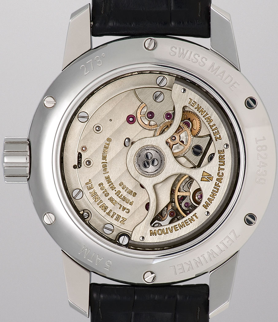 Модель оснащена мануфактурным автоматическим механизмом Zeitwinkel ZW0103, изготовленным в Zeitwinkel Montres С.А. в Сент-Имье, Швейцария, состоящим из 387 деталей, на 49 камнях, с балансовой частотой 28800 полуколебаний в час (4 гц), запасом хода 72 часа, функциями индикации часов, минут (посредством соответствующих центральных стрелок), секунд (на малом боковом циферблате, расположенном на 6 часах), даты (посредством соответствующего цифрового указателя в большой сдвоенной апертуре, расположенной между 10 и 11 часами) и запаса хода (посредством соответствующего аналогового указателя, расположенного между 1 и 2 часами). Калибр отлично отделан (в частности, края мостов и платины скошены и полированы, декорирован Côtes de Genève и Pearlage) и отрегулирован в пяти позициях.