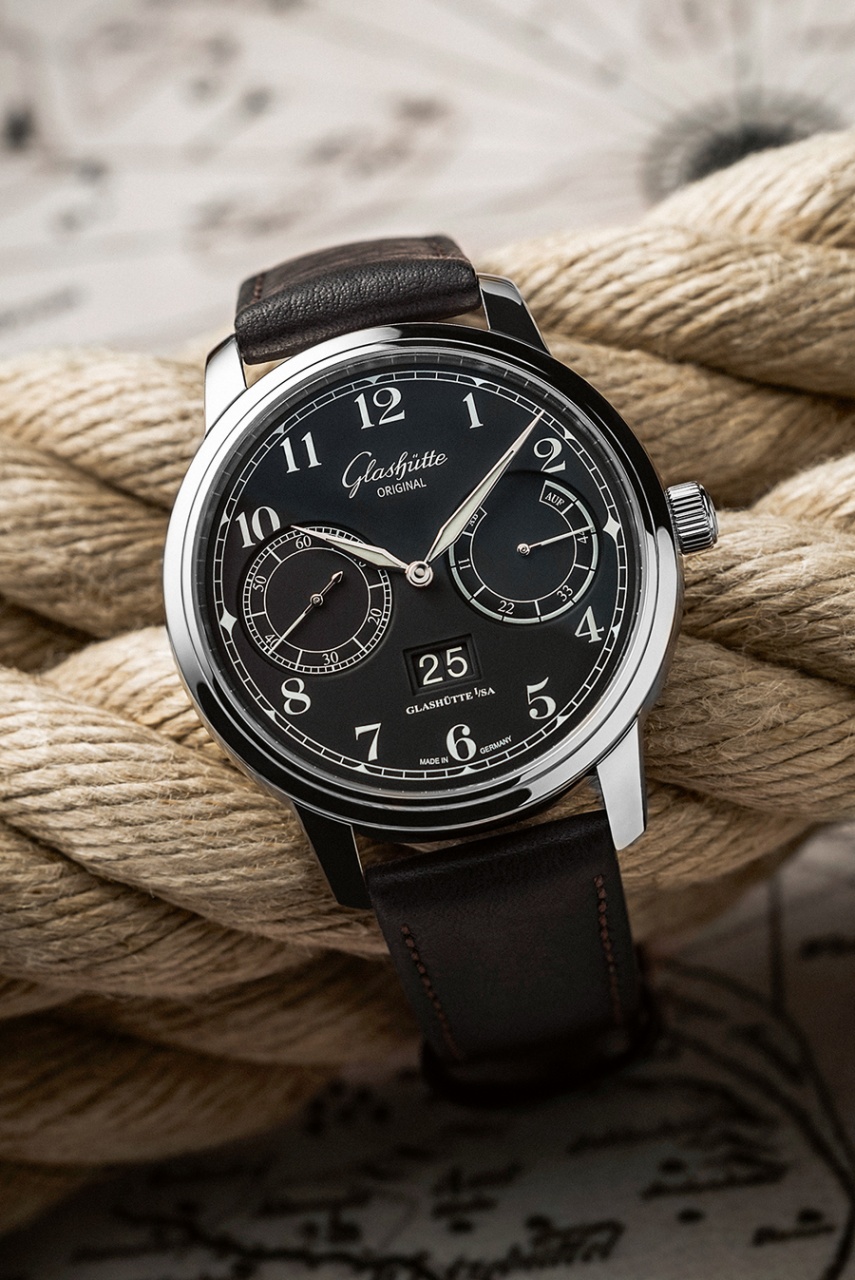 от немецкой часовой мануфактуры Glashütte Original, которая официально представлена на проходящей в настоящее время крупнейшей в мире международной выставке Baselworld-2015, выполнена в традициях морских палубных часов.