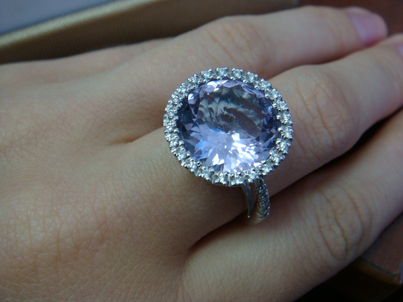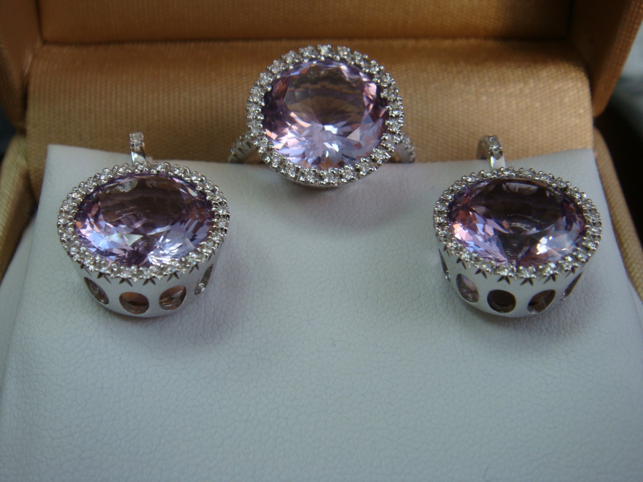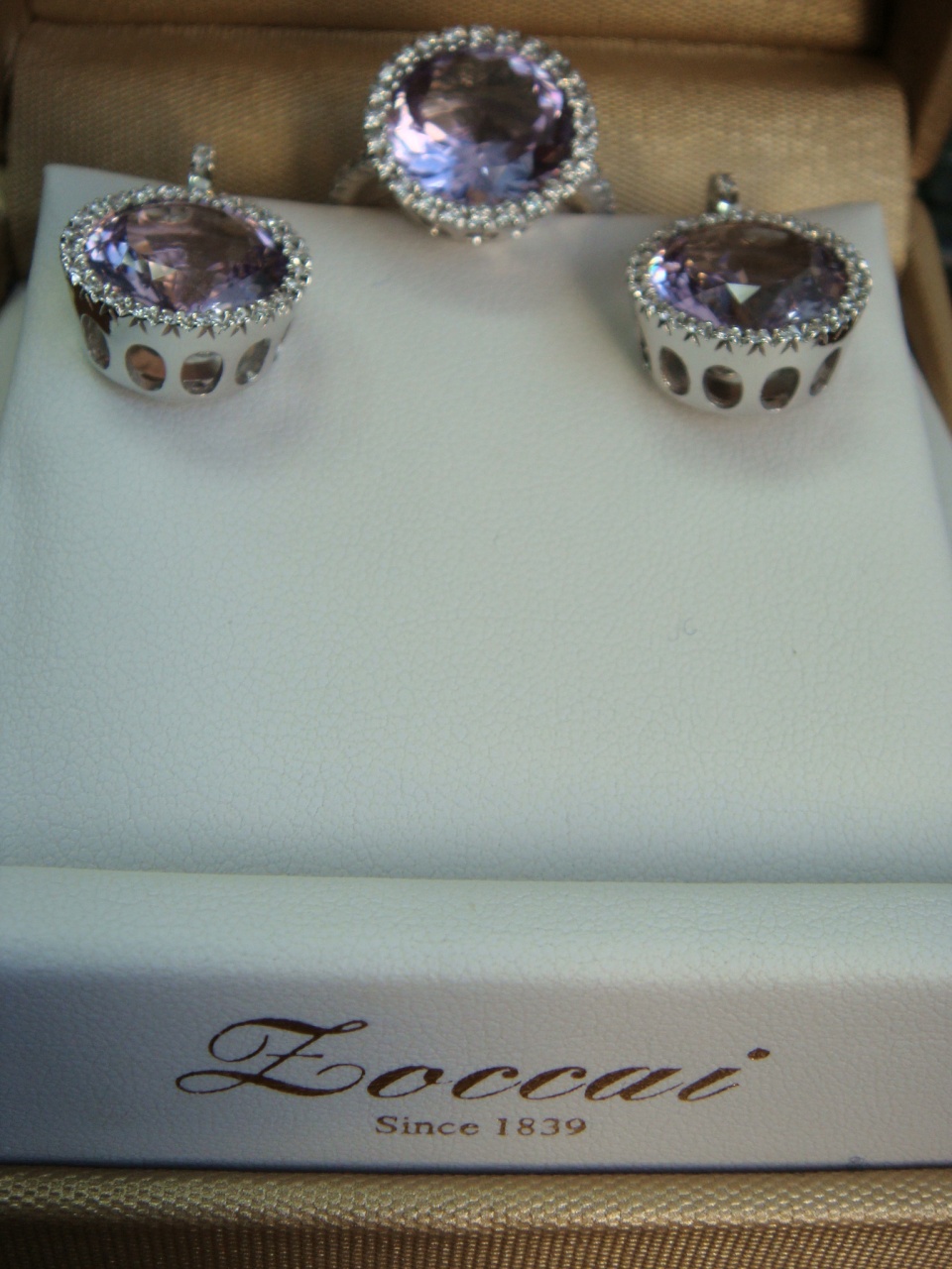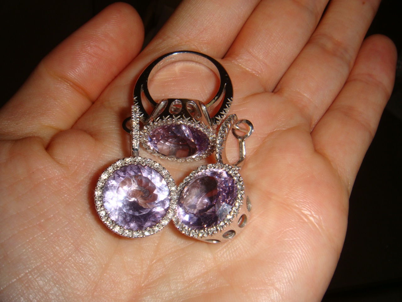 Великолепный набор из кольца и серёг от итальянского бренда Zoccai. Белое золото 18 К (750 пробы), три роскошных аметиста диаметром 15 мм и высотой 8 мм каждый, вокруг россыпь бриллиантов. Изделия 100 % оригинал, клеймо бренда можно увидеть с оборотной стороны кольца и серёг.