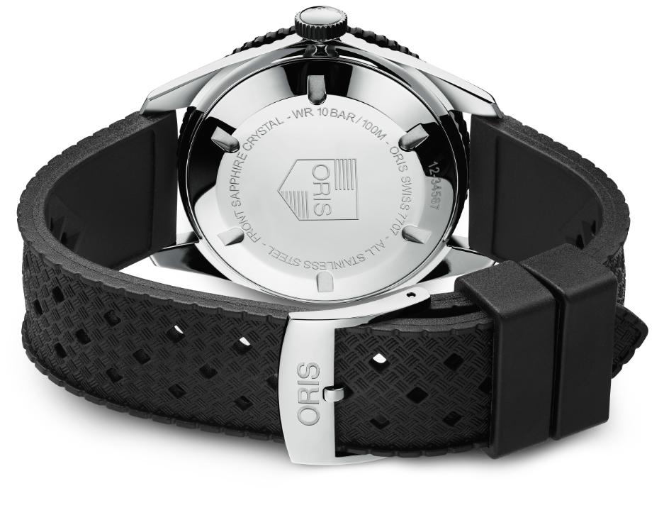 Полированный круглый корпус новинки изготовленный из нержавеющей стали, диаметром 40,0 мм, водонепроницаемый до 100 метров. Завинчивающаяся рифленая заводная головка расположена на 3 часах. Однонаправленный вращающийся дайверский алюминиевый безель с черным покрытием, его разметка покрыта люминесцентным составом SuperLuminova. Задняя крышка часового корпуса глухая завинчивающаяся, на ней выгравирована историческая эмблема бренда Oris шестидесятых годов прошлого столетия. Выпуклое сапфировое стекло
