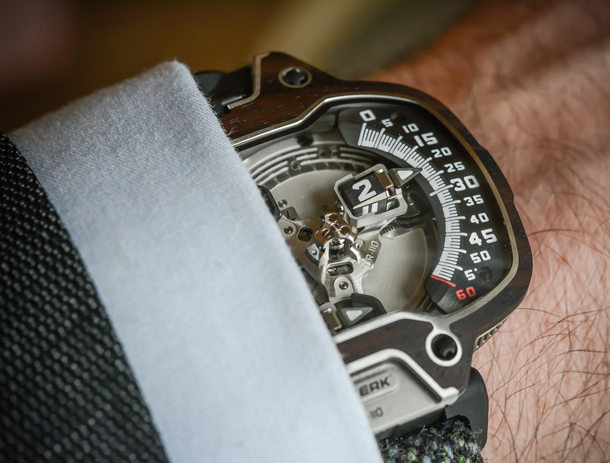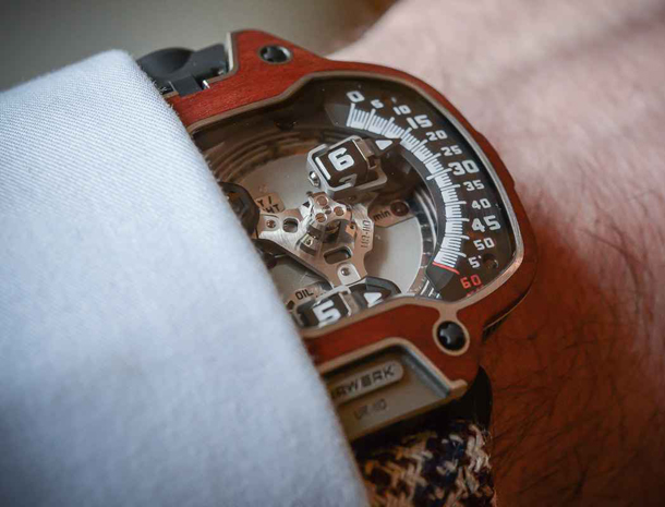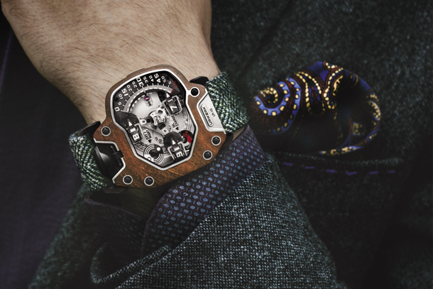 Модели Urwerk UR-110 серии ‘Torpedo’ всегда были достойными произведениями инженерной промышленности с их дополнительными усложнениями и совершенно необычными формами. По ним не скажешь, что они простые в использовании – это все-таки самая экстремальная коллекция бренда. Запущенные в 2011 году, первые модели получили приз за лучший дизайн на Grand Prix d’Horlogerie в Женеве и с тех пор выпускались в разных вариациях: из титана, платины, красного золота и с черным покрытием DLC. Под занавес коллекции Фрай и Баумгартнер решили пойти другим путем и выпустить новую беспрецедентную модель с комбинацией материалов, соответствующим их личным вкусам: ценная древесина и дорогая ткань.