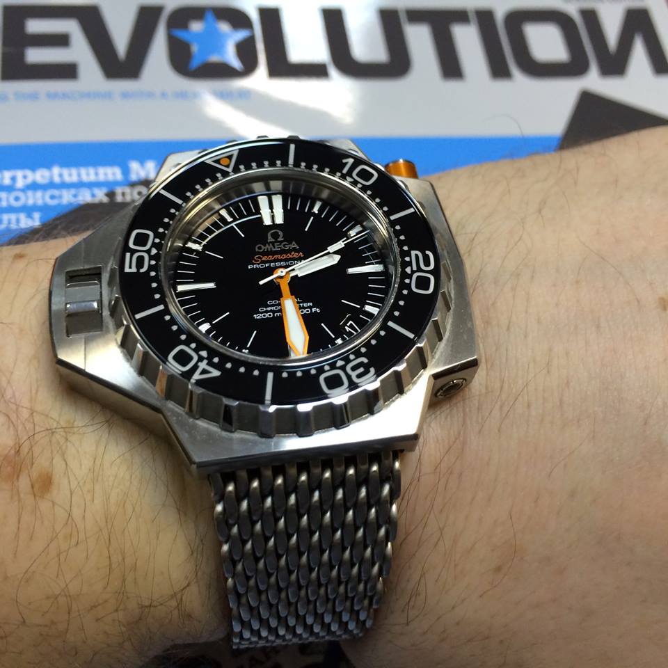 "А вшивый все о бане". По моему новому стим-панковому любимцу, который уже классика - Omega Seamaster Ploprof 1200M. О браслете пару слов - миланское плетение на основе дайверской кольчуги супротив акул. Правда. Ну, то есть, если владельцу дорогого хронометра зверюга вцепится ,именно, в запястье, ни пса не выйдет, часы с руки не упадут, пущай и с родного "манипулятора" давно отъеденного. Ежели серьезно, профешенел агрегат, с двойным очень сложным миланским плетением, подстраиваемый ( принцип , как у IWC последнего пилотского, даже по духу) одним нажатием кнопищи. Я стал несколько худосощный в чреслах, поэтому снял одно звено (предусмотрено), дабы не раздвигать баклю на доп-сегмент...ну , так я люблю. Бакля - отдельный роман - безумная гравировка морского конька , ну и лого омеги-симастера....массивная, и-за чего, паутинно-царапается через несколько минут владения. Браслет - классный... по всем канонам и стандартам иваси-ролекс-брайтлинг (да даже вашерон), безумно дорого и красиво...но массивность его прибивает об днище океана, я баклей зацепил сегодня с утра всех и вся чего мог, даже персонального Крысарика, который аж захромал от встречи с прекрасным. Посмотрим-поносим. Как вариант - куплю к нему его фирменный каучуковый стреп, хотя, скорей-всего, это будет уже не торт.