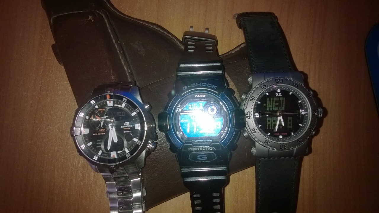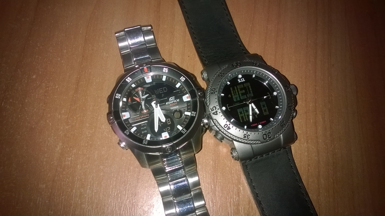 Из минусов. Аналоговые и цифровые часы не синхронизируются автоматически, как у Касио (сравниваю с моделью EMA-100) И за месяц аналог убегает вперед на 5-7 секунд (мелочь конечно, но бесит). Полимерный ремешок достаточно жесткий, и кожа под ним потеет (хотя сделаны проточки по длине) в отличии от полимера на CASIO G-8900A-1E. Хотя может и разносится со временем. Кожаный ремень очень хорош (очень толстая и мягкая кожа), но я привык к довольно жесткой эксплуатации и поэтому его редко ставлю, просто жалко. Будильник только один, опять же привык, когда у Касио 3 или 5) По минусам вроде всё. Ну может еще и цена в 315 баксов, на оффсайте.