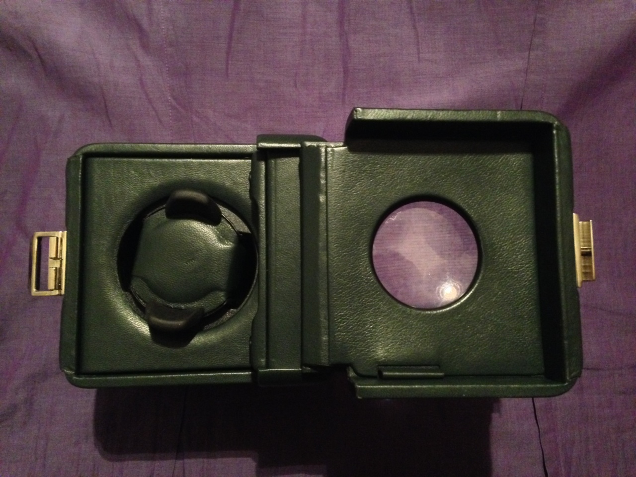 Достаточно компактная, можно брать в путешествия или хранить в малогабаритной ячейке. Полностью отделана кожей снаружи и внутри. На дверце увеличительное стекло для созерцания магического действа подзавода.