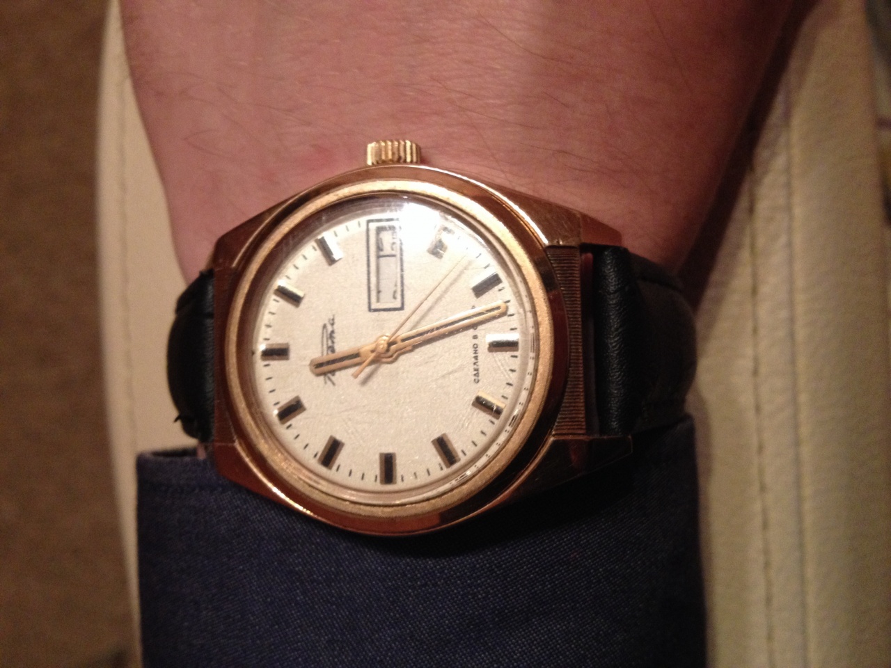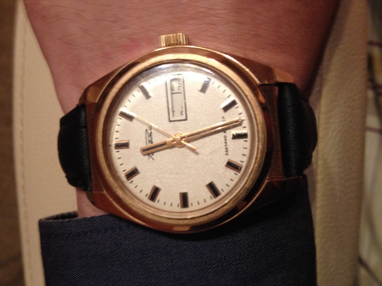 Сегодня нашёл Ракету деда, подаренную ему, судя по гравировке, в 1985 году. Переполнили меня чувства, сразу я их на руку надел и снимать не хочу. Лежали они в том шкафу 9 лет минимум, завёл - пошли, выставил число с днём недели, за 8 часов хода точность отличная, поменял родной ремень на новый.
