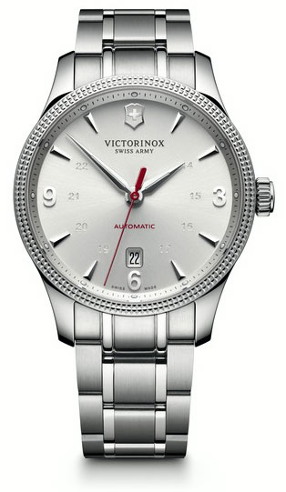 Круглый полированный корпус новинки, изготовленный из нержавеющей стали, диаметром 40,0 мм,водонепроницаемый до 100 метров. На торце завинчивающейся рифленой заводной головки, расположенной на 3 часах, выгравирована эмблема бренда Victorinox Swiss Army. Фиксированный круглый безель с двухрядной зубчатой отделкой. Задняя крышка часового корпуса завинчивающаяся. Сапфировое стекло с тройным антибликовым покрытием защищает серебристо-белый или льдисто-черным циферблатом с накладными арабскими цифрами и часовыми индексами, с дополнительной 24-часовой разметкой, а также с точками на фланце, часовой и минутной стрелками, покрытыми люминесцентным составом белого цвета. Секундная стрелка красного цвета. Таким-же цветом выполнена надпись "Automatic" на циферблате.