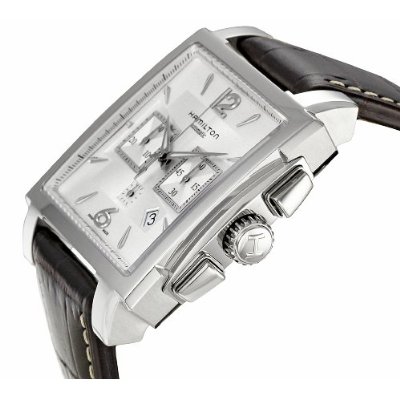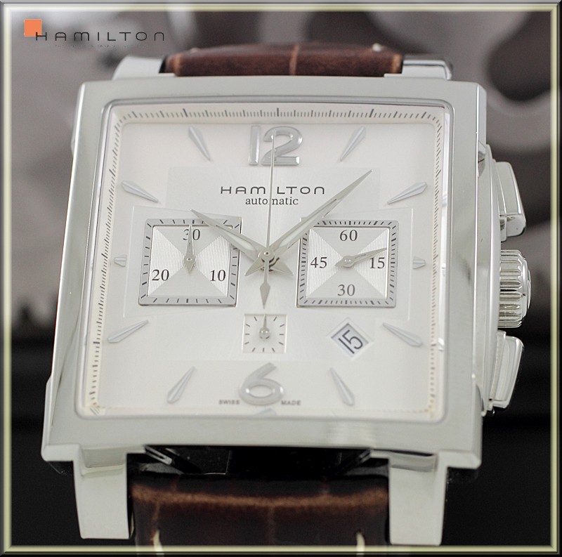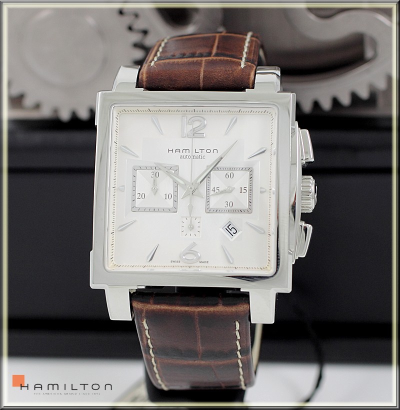Новые механические мужские часы хронограф Hamilton в полной заводской комплектации, гарантия производителя 2 года. Корпус этих часов выполнен из нержавеющей стали и имеет элегантную квадратную форму. Серебристый циферблат хрогонрафа имеет дополнительные малые циферблаты. Кожаный ремень благородного шоколадного оттенка красиво оттеняет элегантный корпус хронографа.