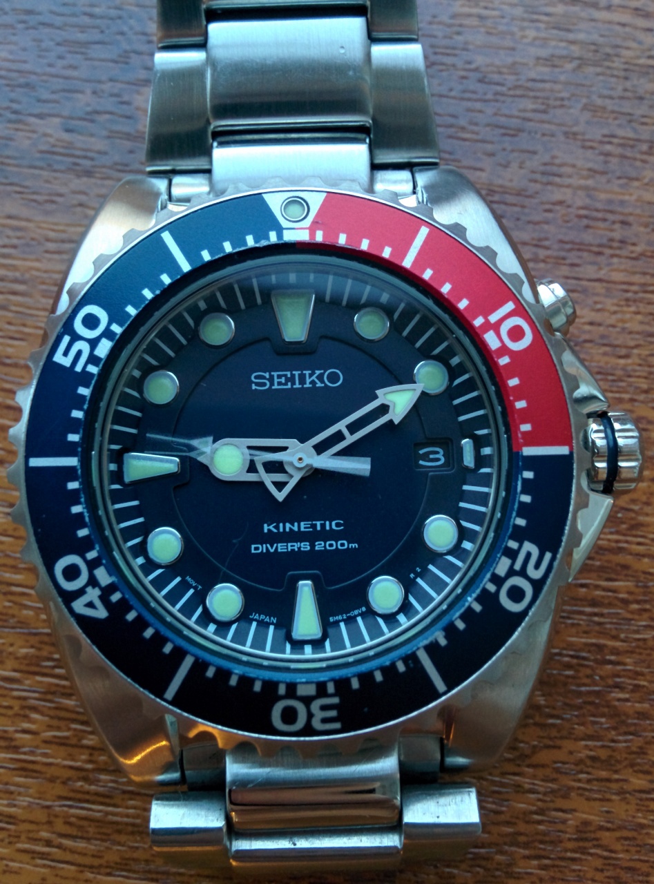 Продаю брутальный кинетический дайвер Seiko SKA369P1 Pepsi. Часы покупались год назад новыми у уважаемого форумчанина. Есть маленькие царапины на браслете и на безеле, ничего критичного (видно на фото), стекло без царапин. Полный комплект + оригинальный каучуковый ремешок (новый) и дешевенький нато. Вообщем, полный набор на лето! К часам никаких нареканий, продаю по причине покупки Сумо синеньких