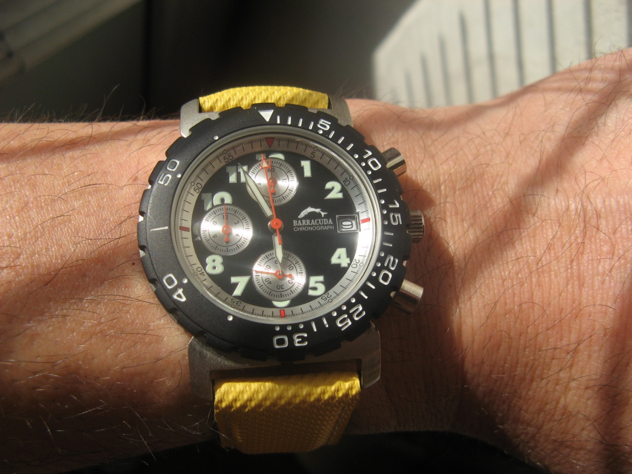 Попались мне прилюбопытные часики! Состояние просто новые, то есть совершенно. Не считая некоторых потёртостей на задней крышке. Спереди так вчера из коробки вытащили. Очень необычное сочетание цветов и ремня! И... что особенно удивило, сапфировое стекло! Проверил каплей воды несколько раз, потому что сперва не поверил что сие возможно вообще!)) Ремень кожа, снаружи прорезиненное что то.