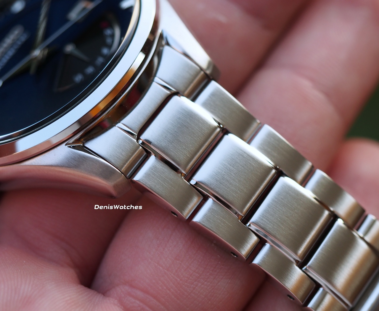 Очень красивый переливающийся синий циферблат, накладные метки и лого