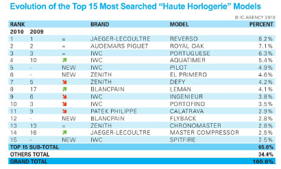 Результаты свидетельствуют о том, что глобальное количество запросов, связанных с десятью брендами Haute Horlogerie увеличилось на 14% по сравнению с 2008. Это обнадеживающий знак, показывающий интерес к эксклюзивной продукции со средней стоимостью выше CHF 15'000, несмотря на сложную экономическую ситуацию.
