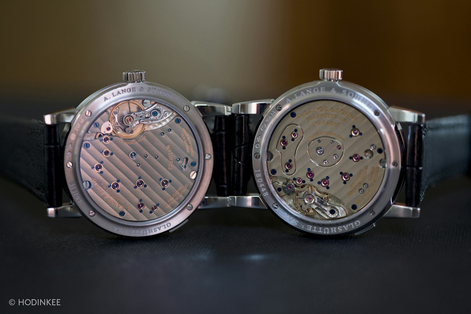 Edge on, there is also little to distinguish the old from the new; thickness, diameter, curvature and length of the horns, finish – all are unchanged from the original to the new. However it’s a different story when you turn the two watches over and compare the movements. Our first hint that these are not identical mechanically comes when we look at the dimensions – those of the movement in the original Lange 1, the L901.0, are 30.4 mm x 5.9 mm, while those of the new version, the caliber L121.1, are 30.6 mm x 5.7 mm.