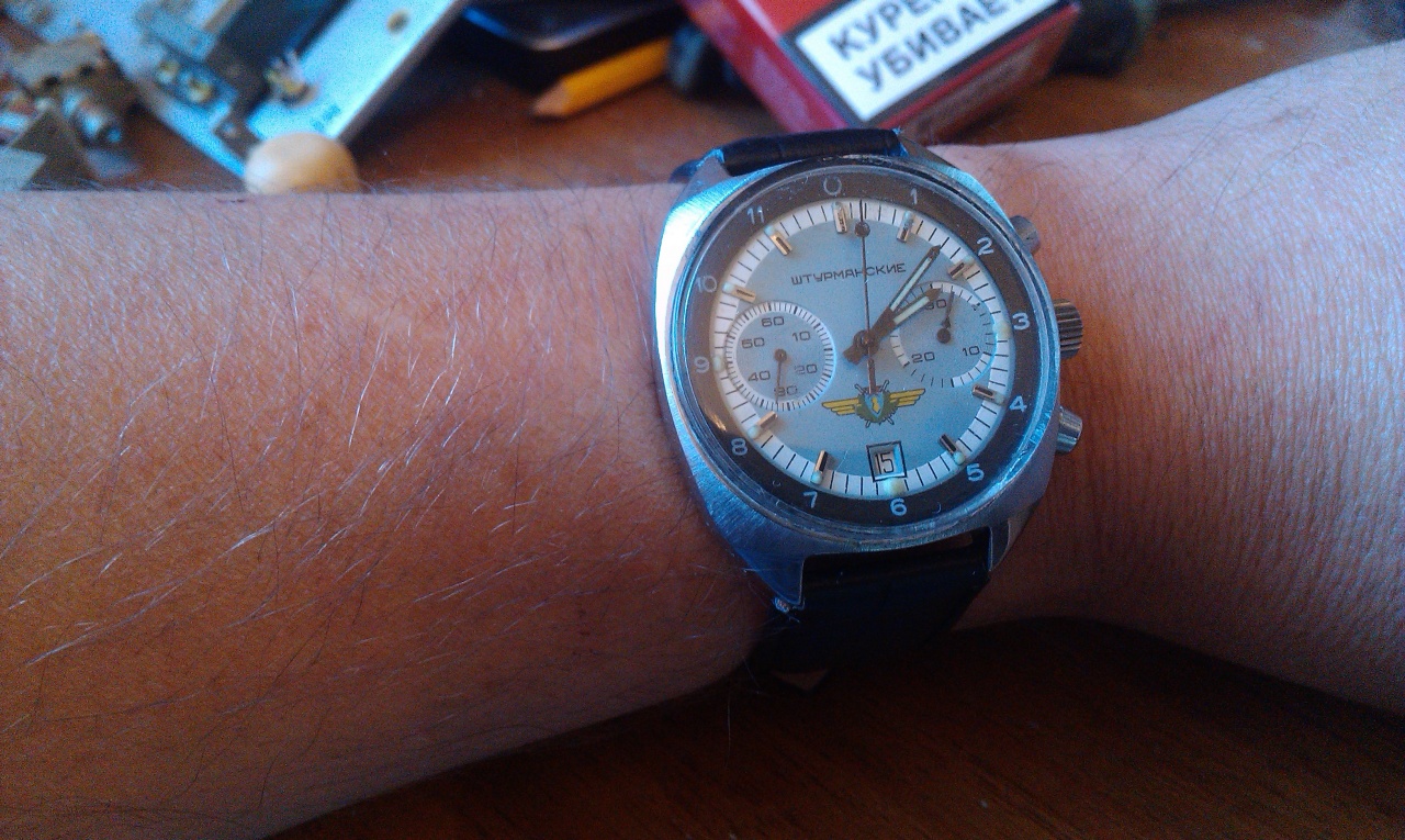 Не далее, как в июле-месяце стал обладателем двух экземпляров часов "Штурманские" с арретиром (мех 31659, соответственно) - один экземпляр с "хлопушкой" в малом корпусе (латунь хром), второй - нержавейка на "винте"с тем, что сейчас принято называть "тахометр", или "тахИметр" - то есть просто с цифером на ободке циферблата.